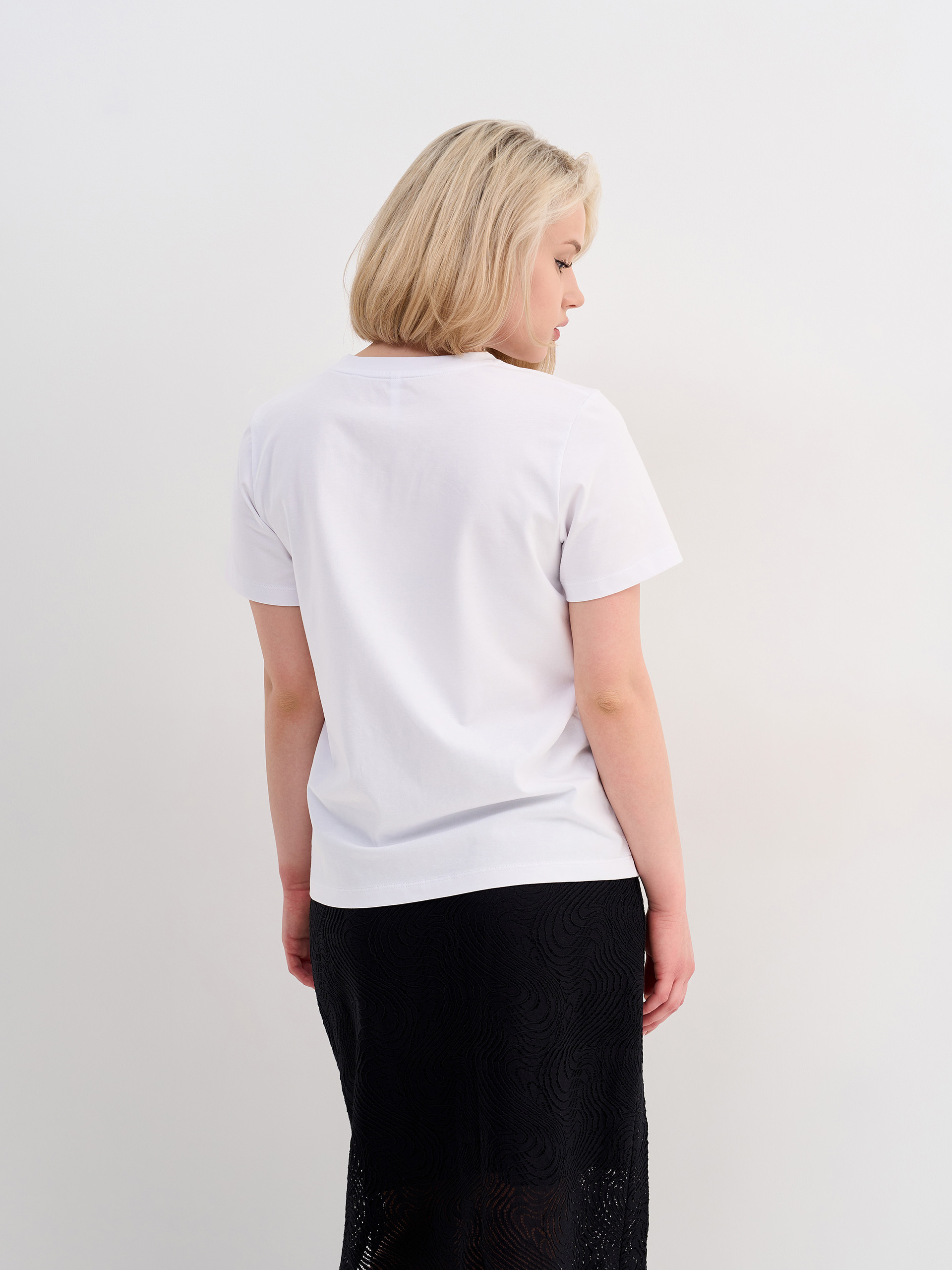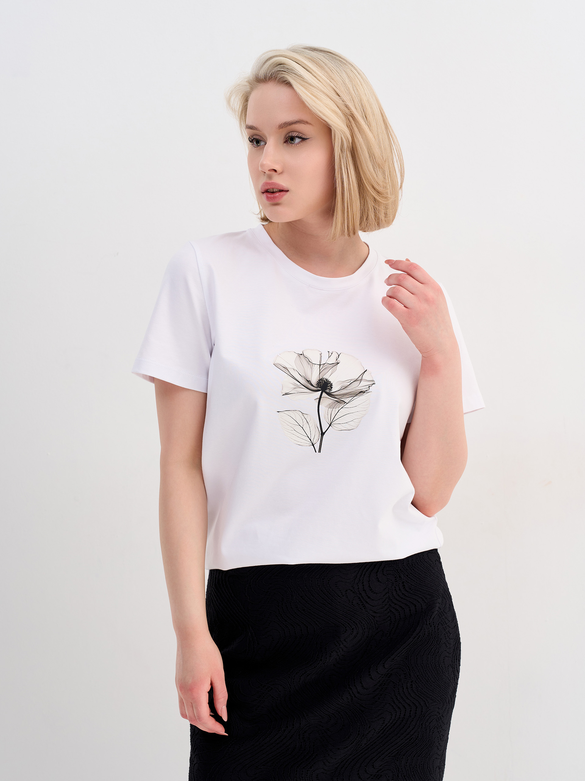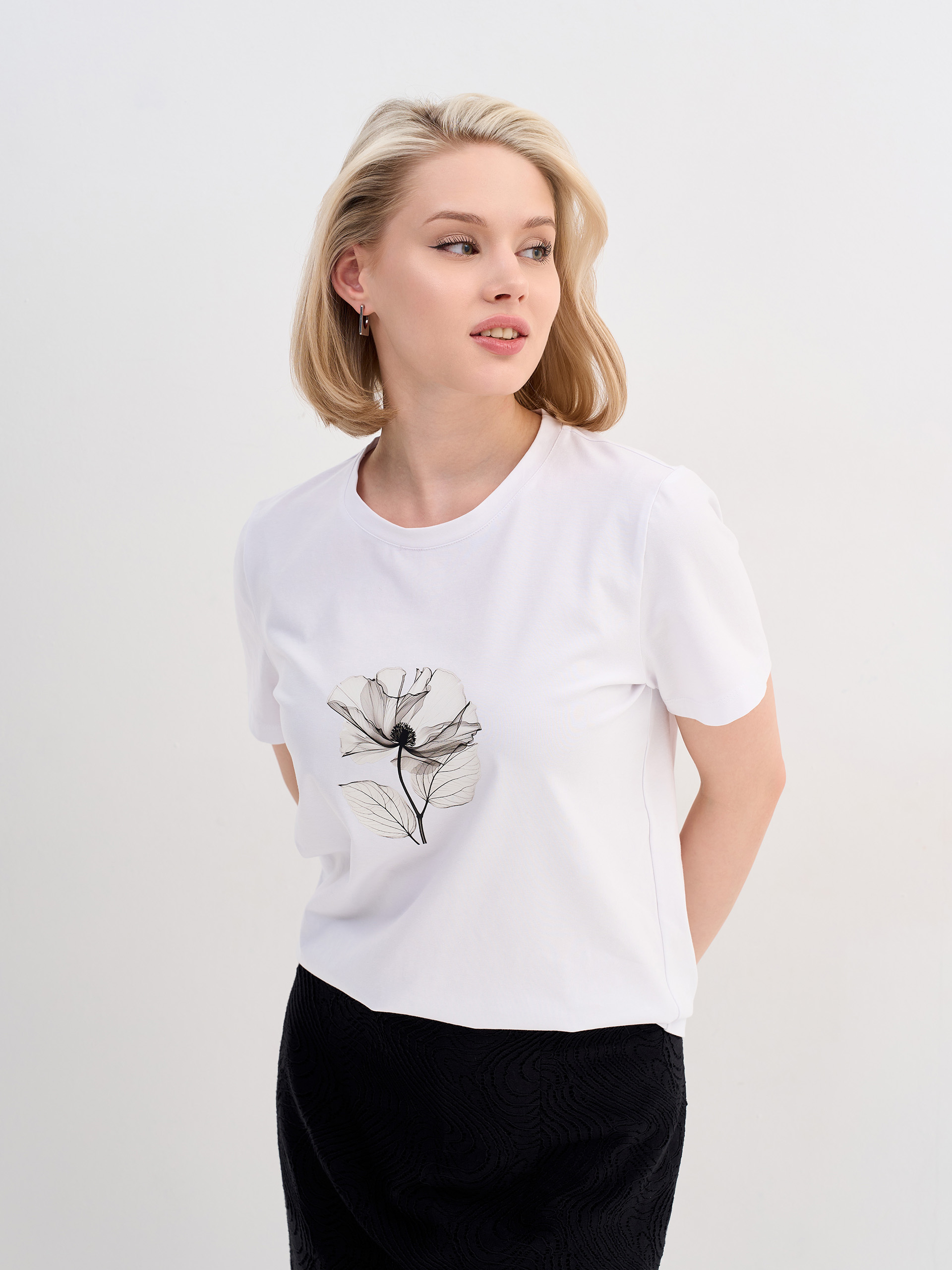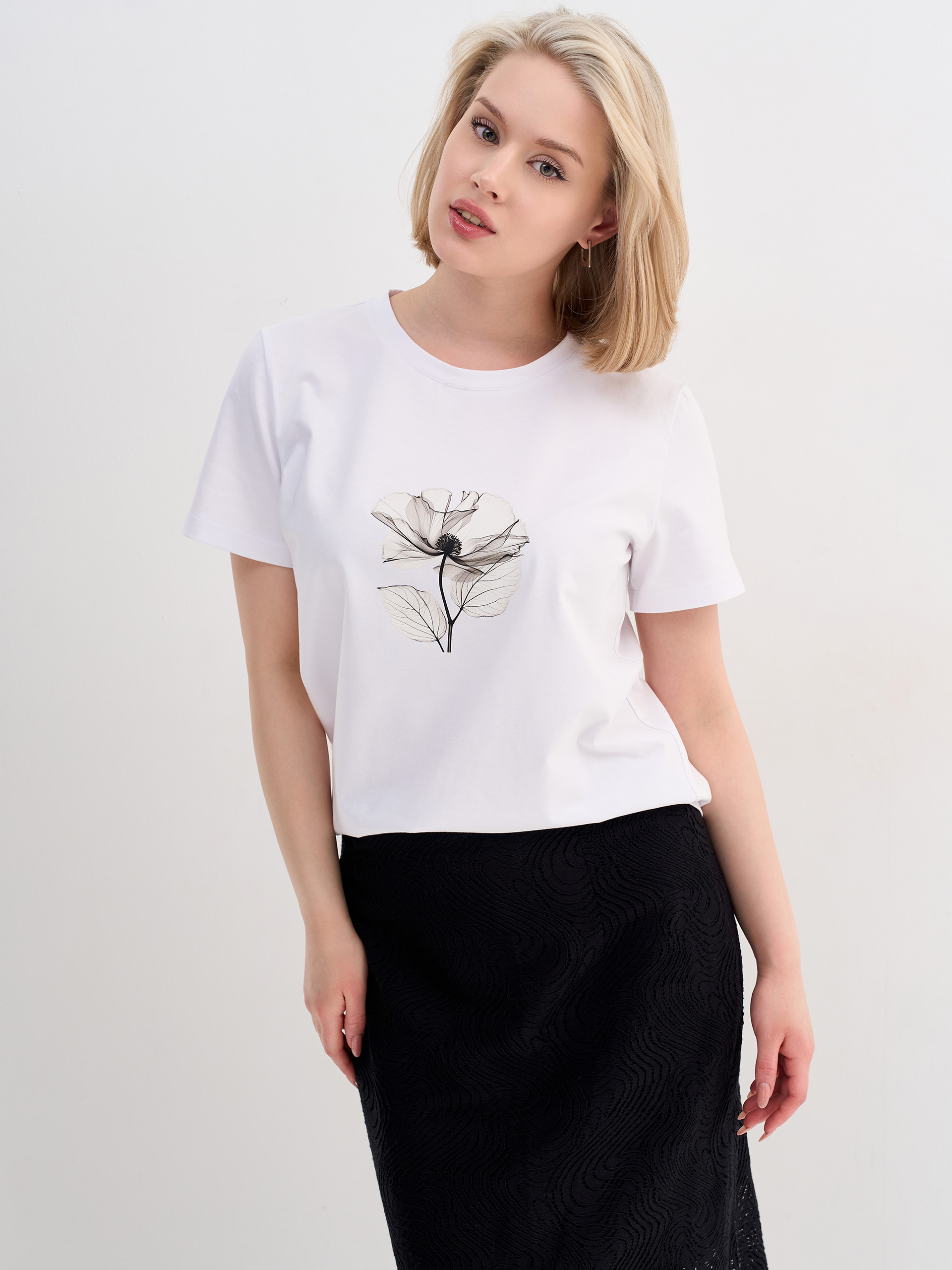Футболка прямого силуэта, из трикотажной кулирной глади белого цвета, округлая горловина, с принтом.