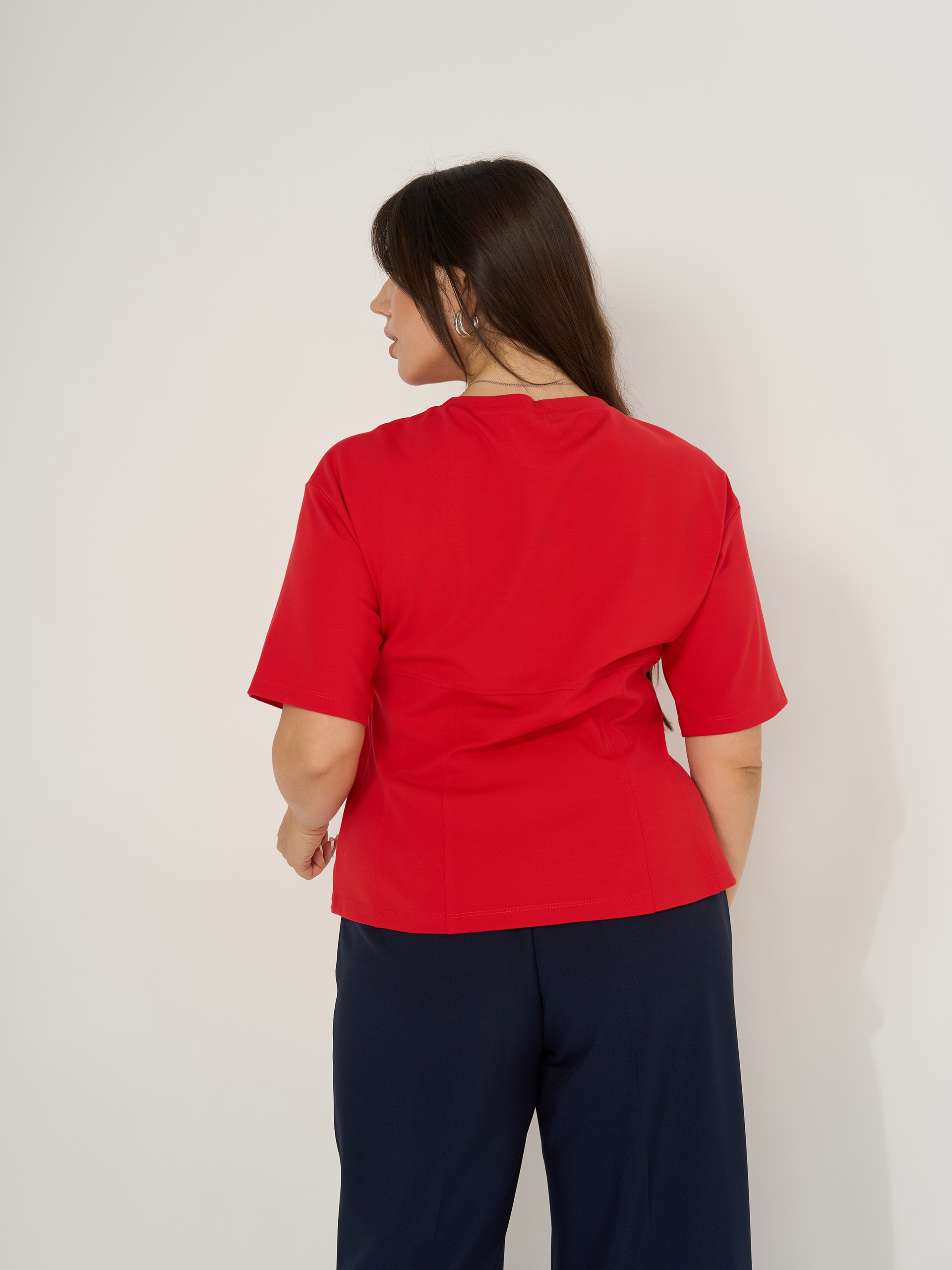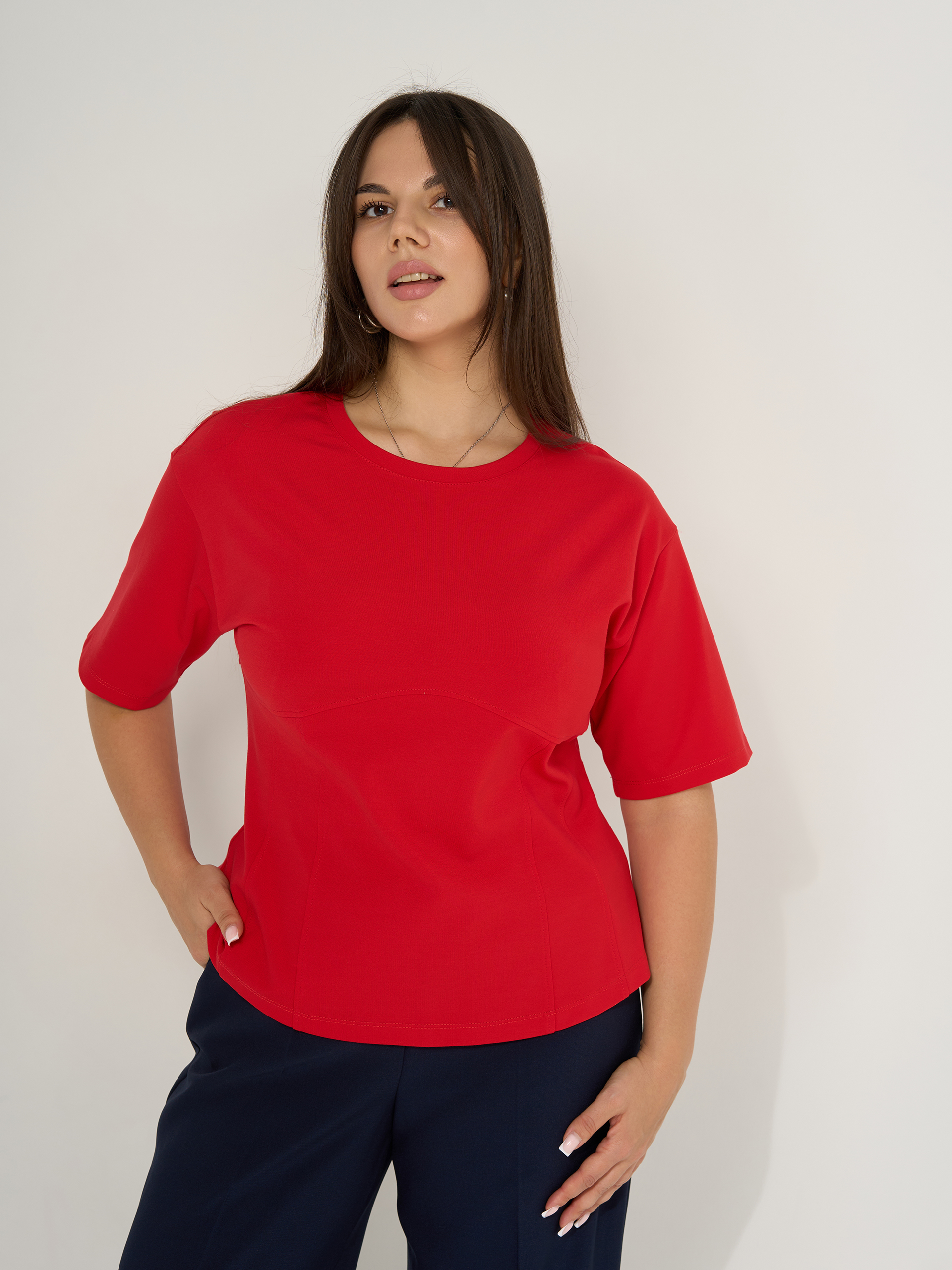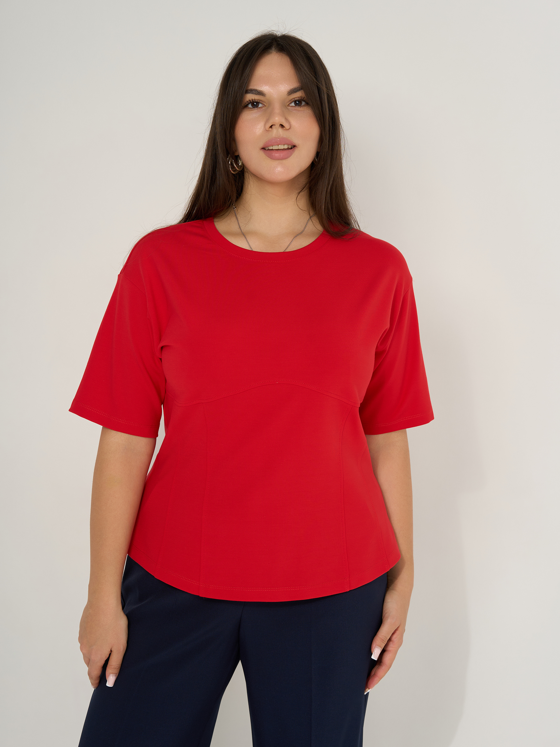 Футболка, полуприлегающего силуэта, с подрезами и рельефами. Со спущенной линией плеча и коротким рукавом. Из вискозного полотна.