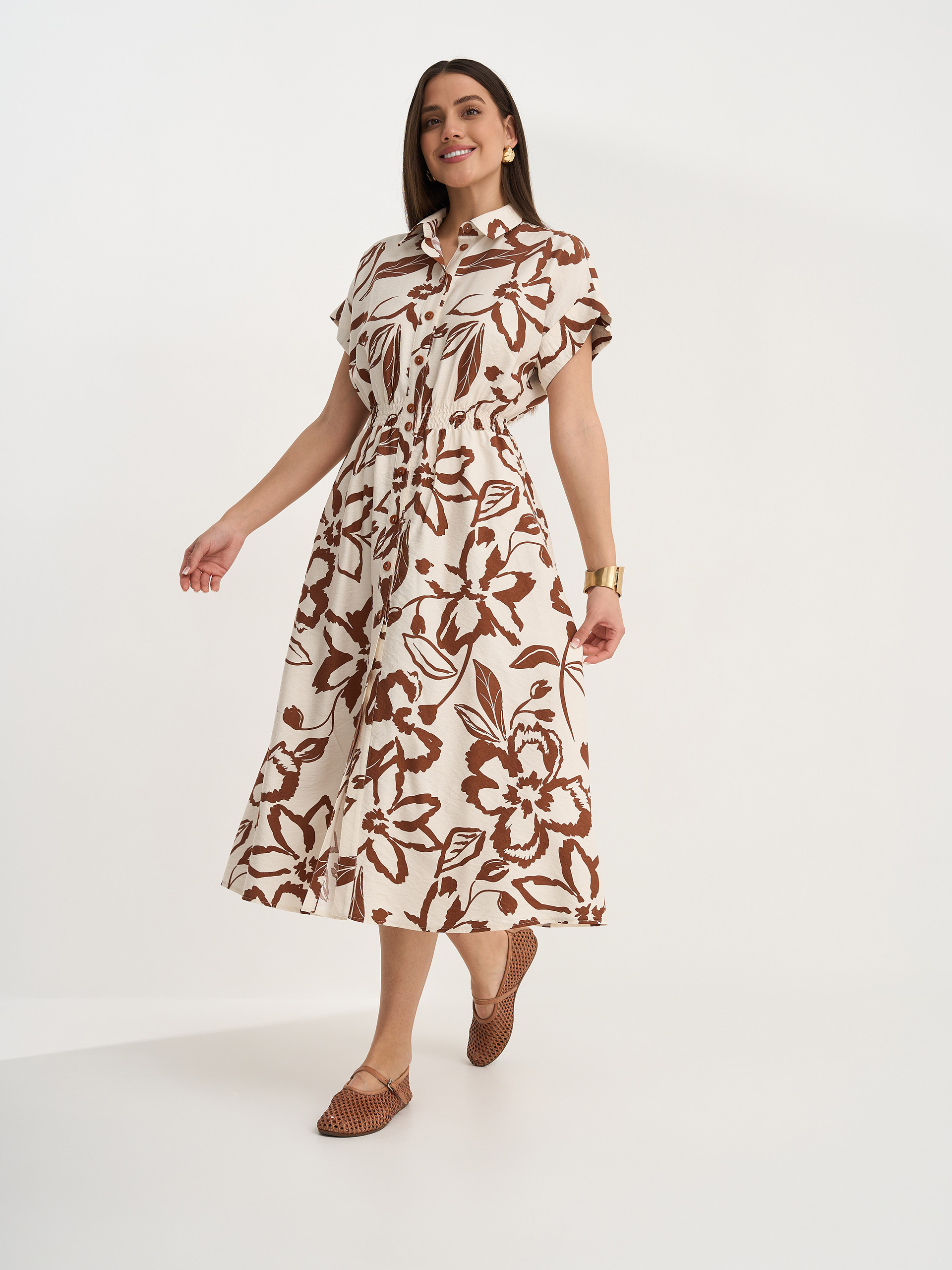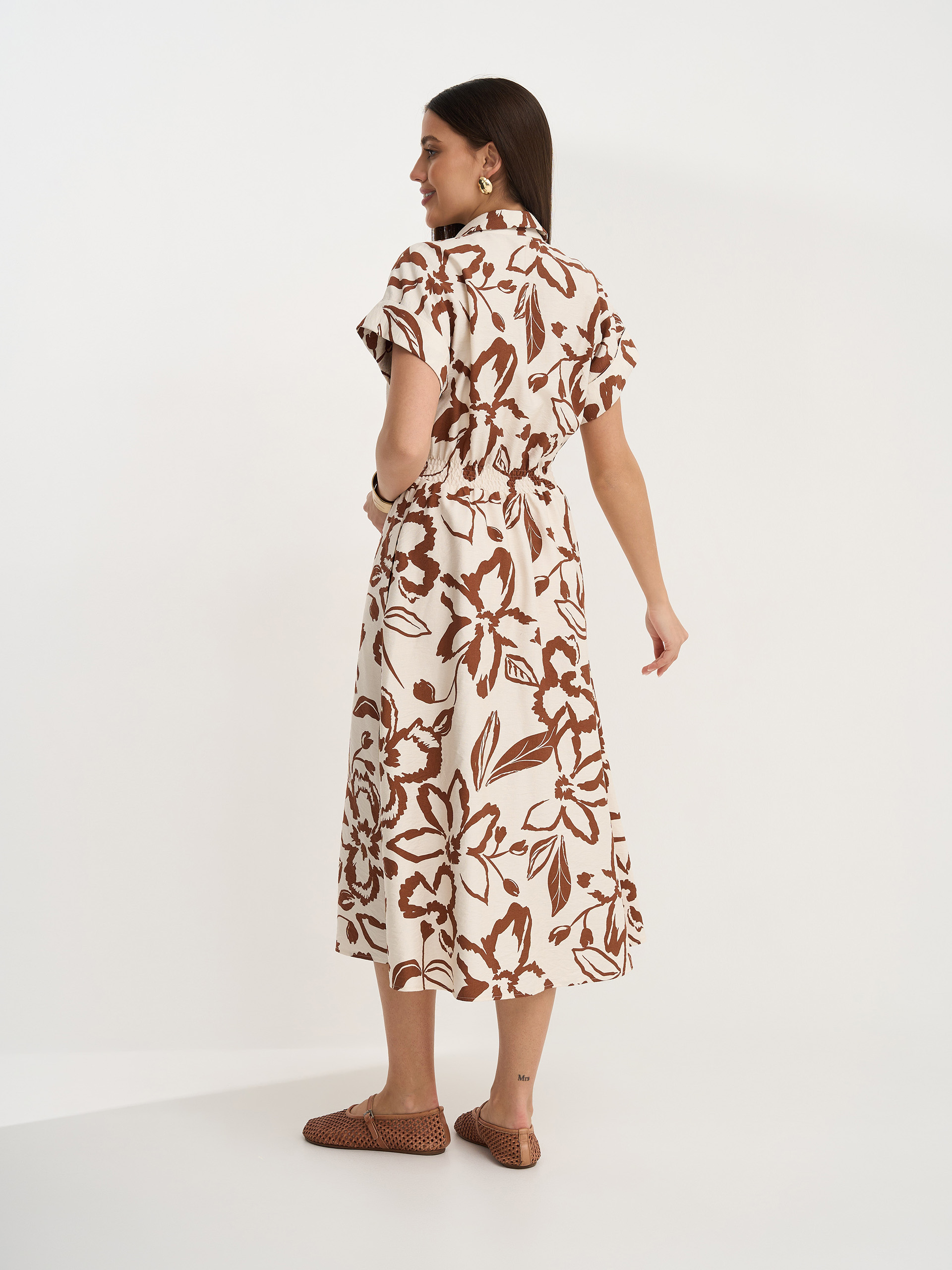 Платье приталенного силуэта, из вискозной ткани? воротник стояче-отложной, спущенная линия плеча, низ рукава с манжетой, юбка А-образная с карманами в боковых швах.