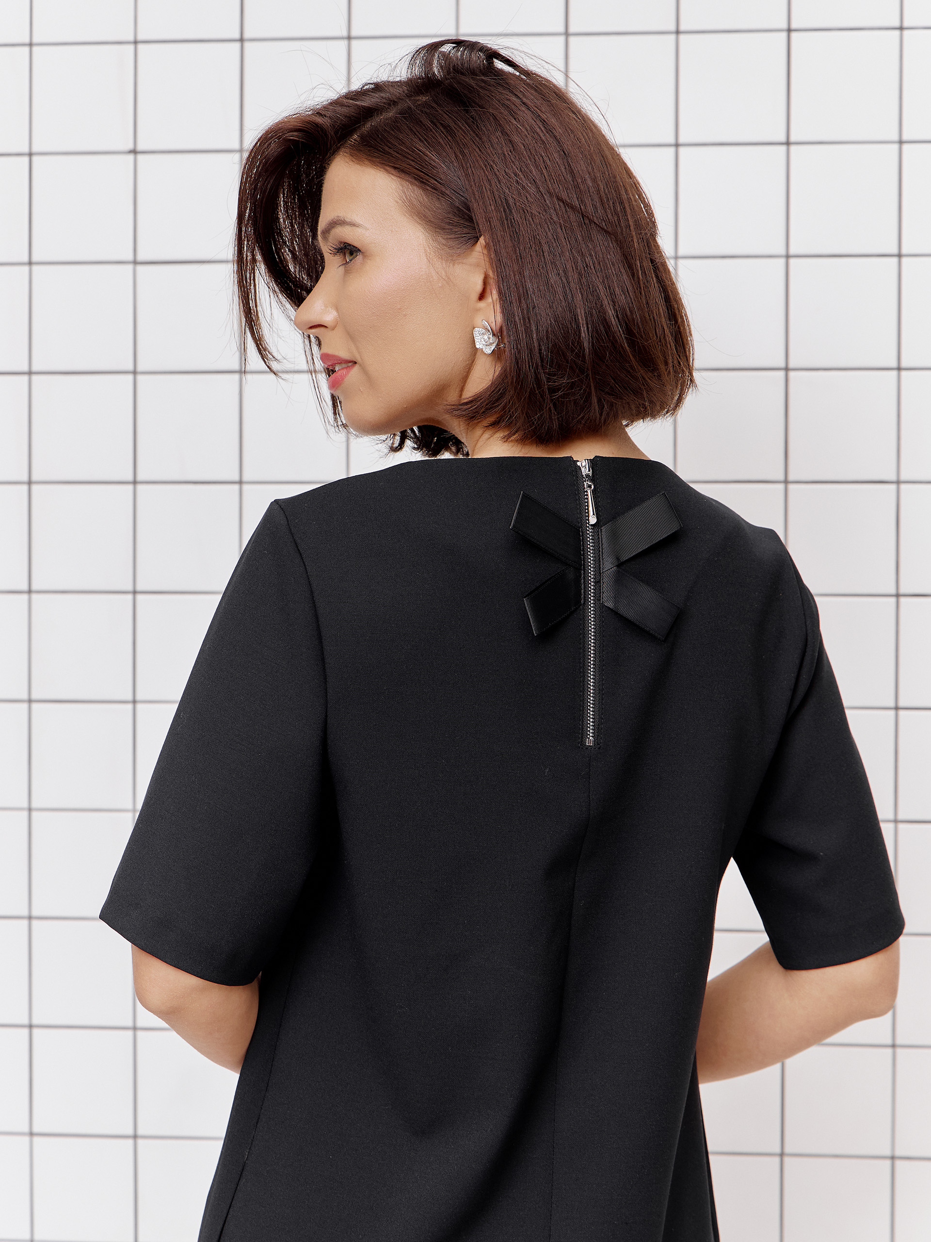 Платье прямого силуэта, из костюмной ткани черного цвета, короткий рукав, карманы в боковых швах, горловина округлая.