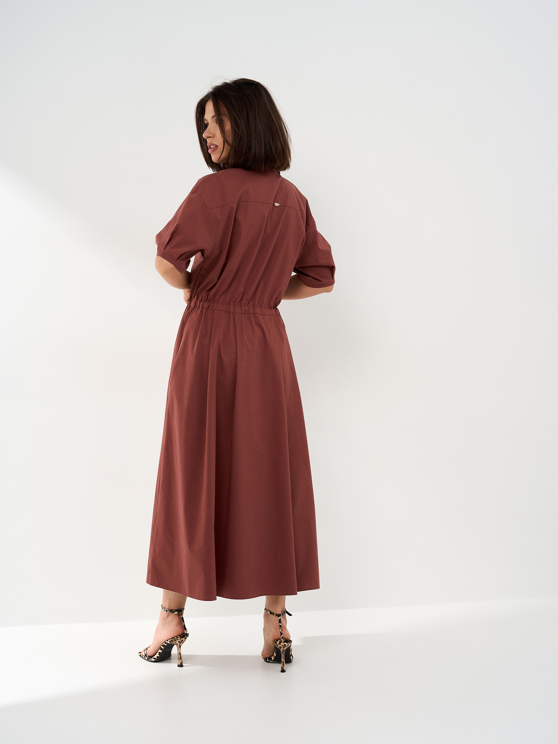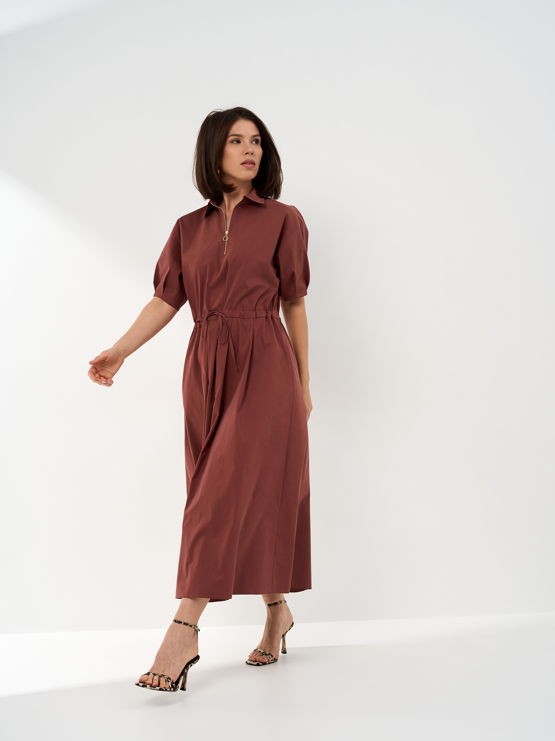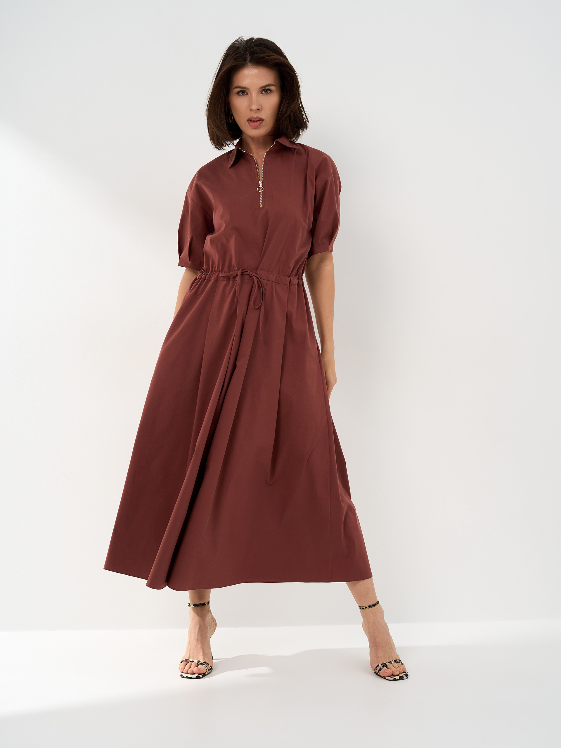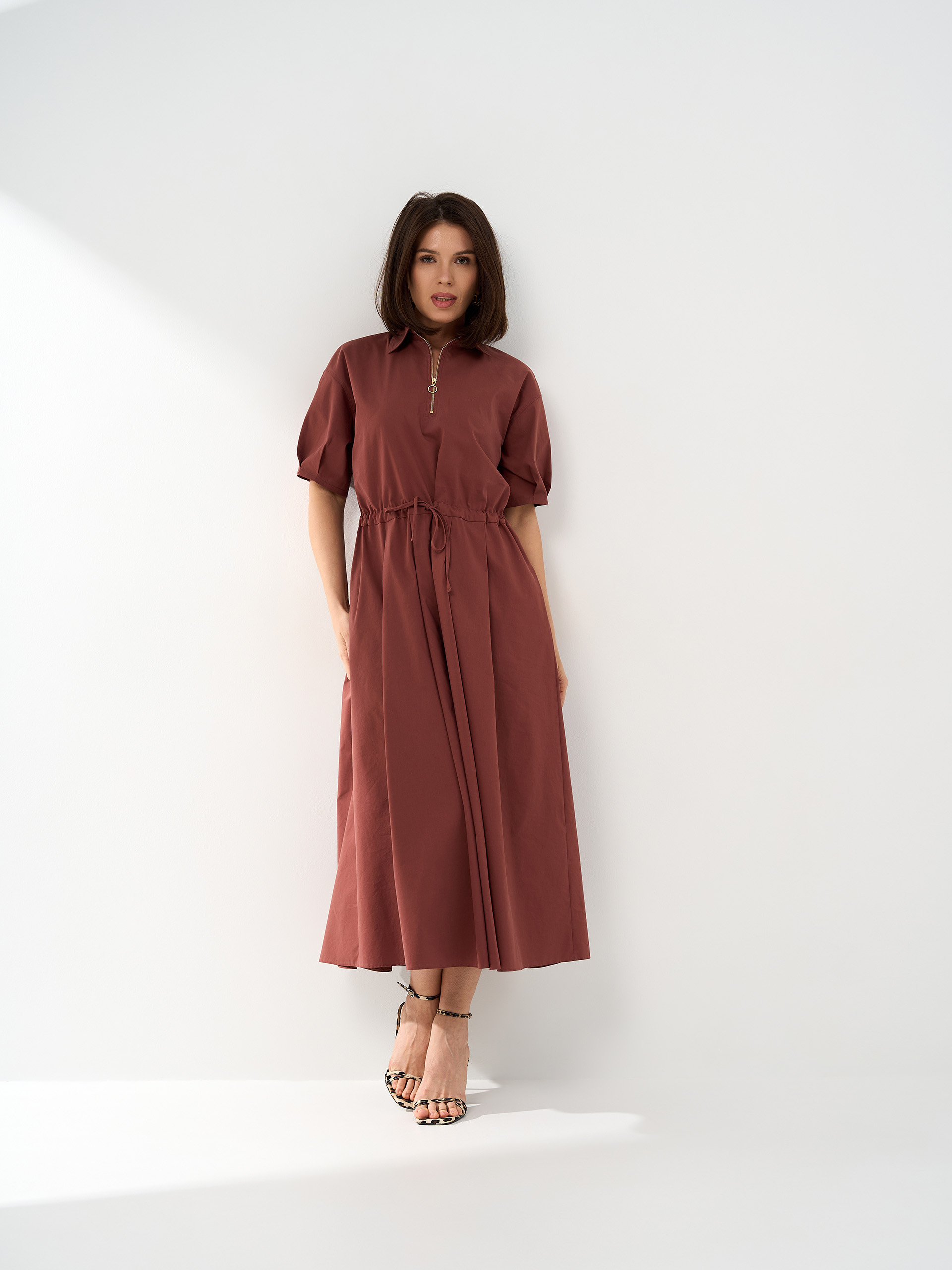 Платье на кулиске, из хлопковой ткани в цвете какао-пудра. Юбка А-образная со складками.