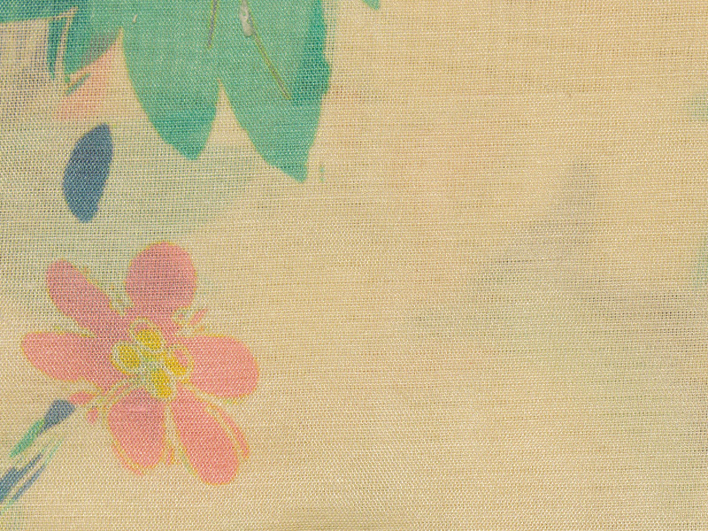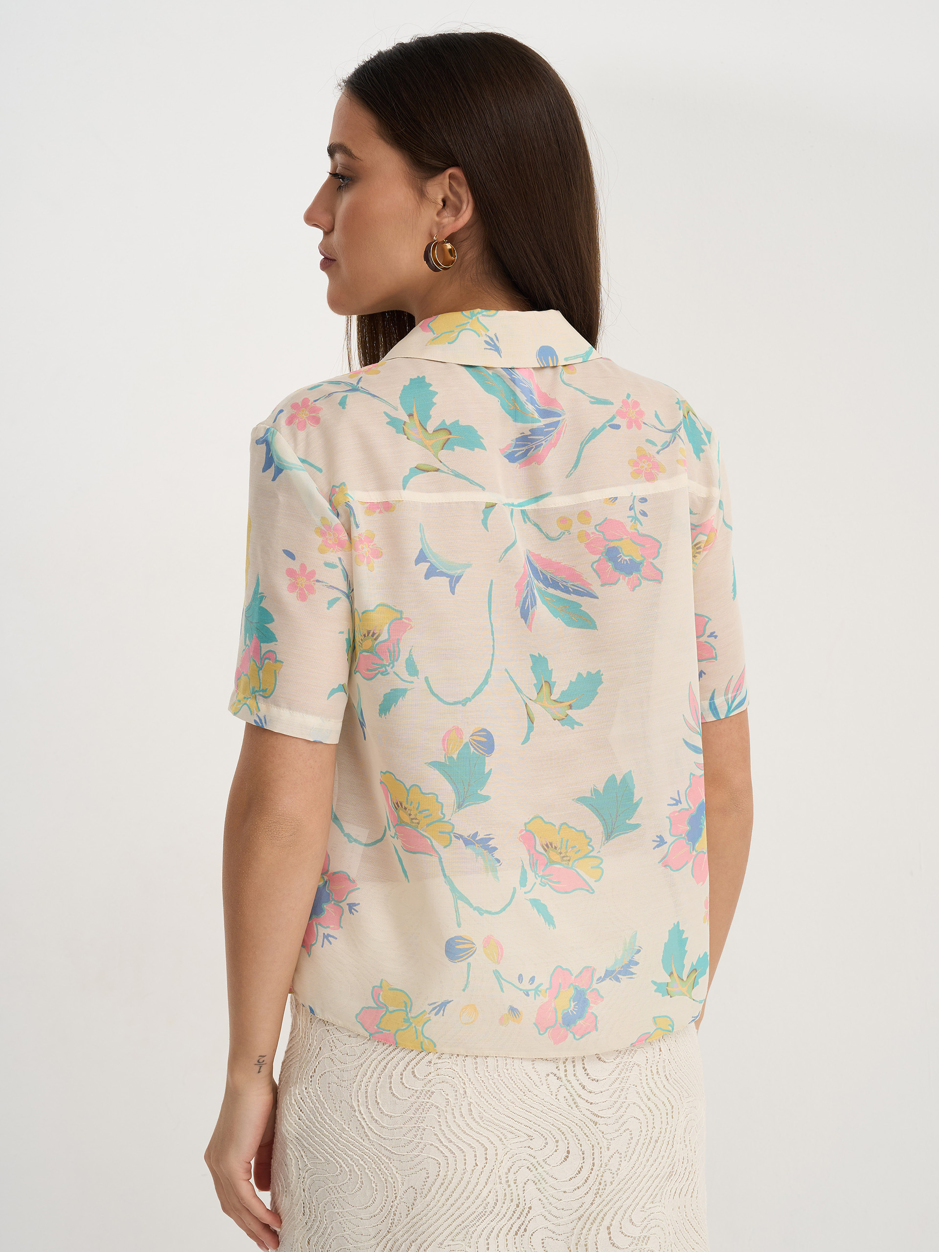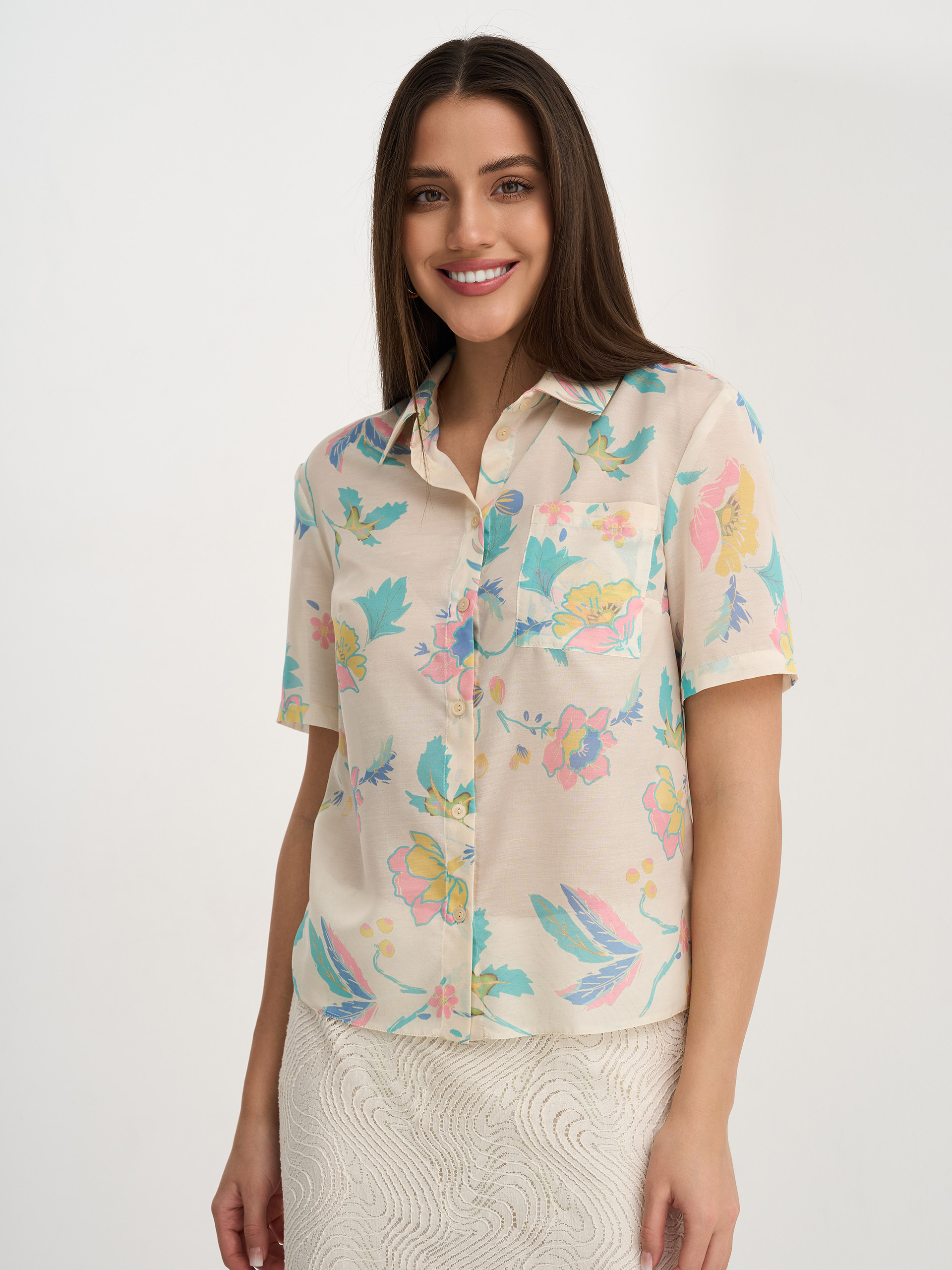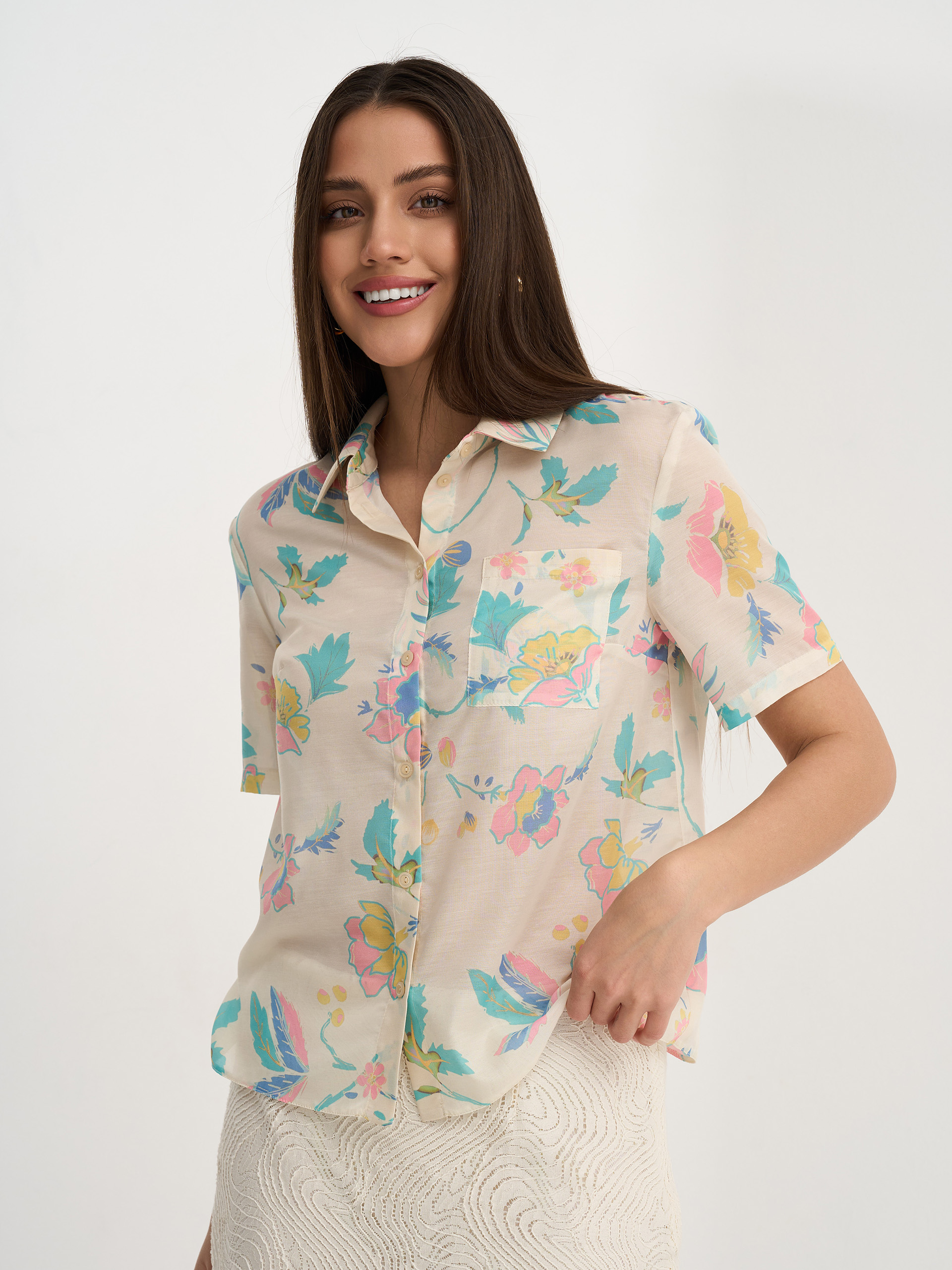 Рубашка укороченная, прямого силуэта, из легкой ткани молочного цвета с принтом, воротник стояче-отложной, короткий рукав.
