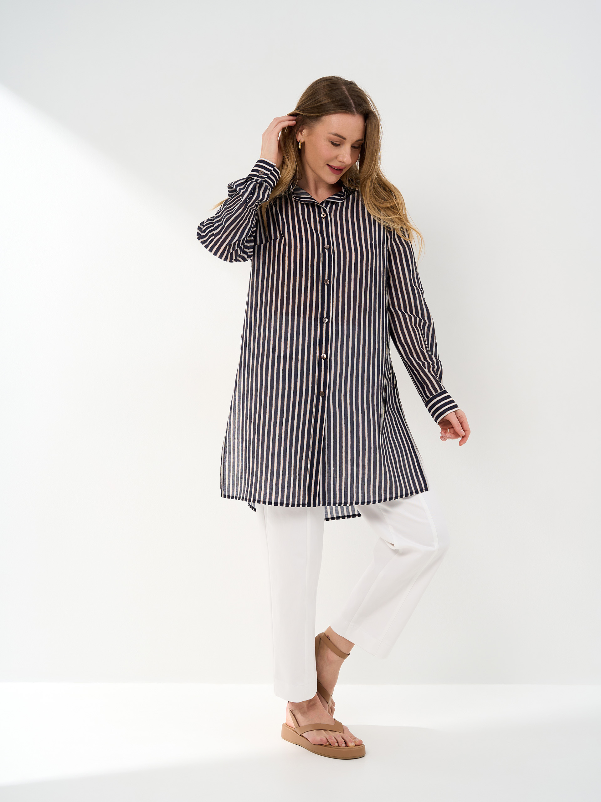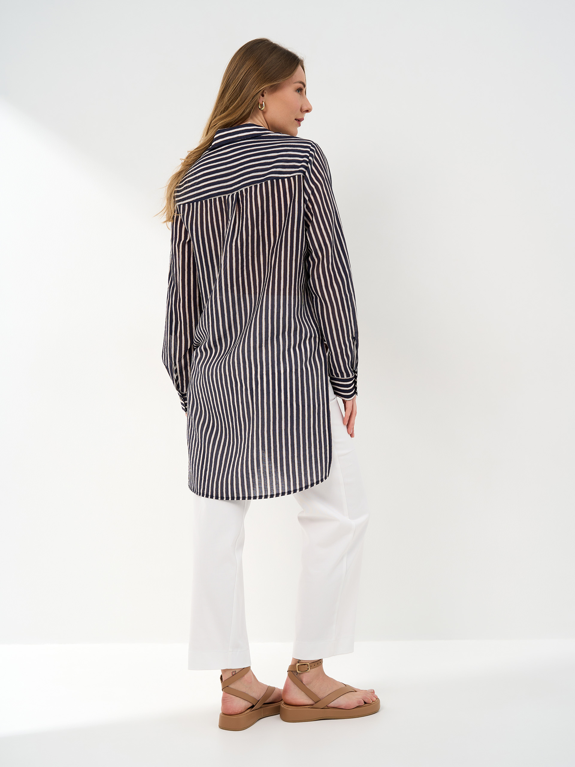 Рубашка удлиненная, из легкой ткани темно-сине-оранжево-белой полоски, разрезы в боковых швах.