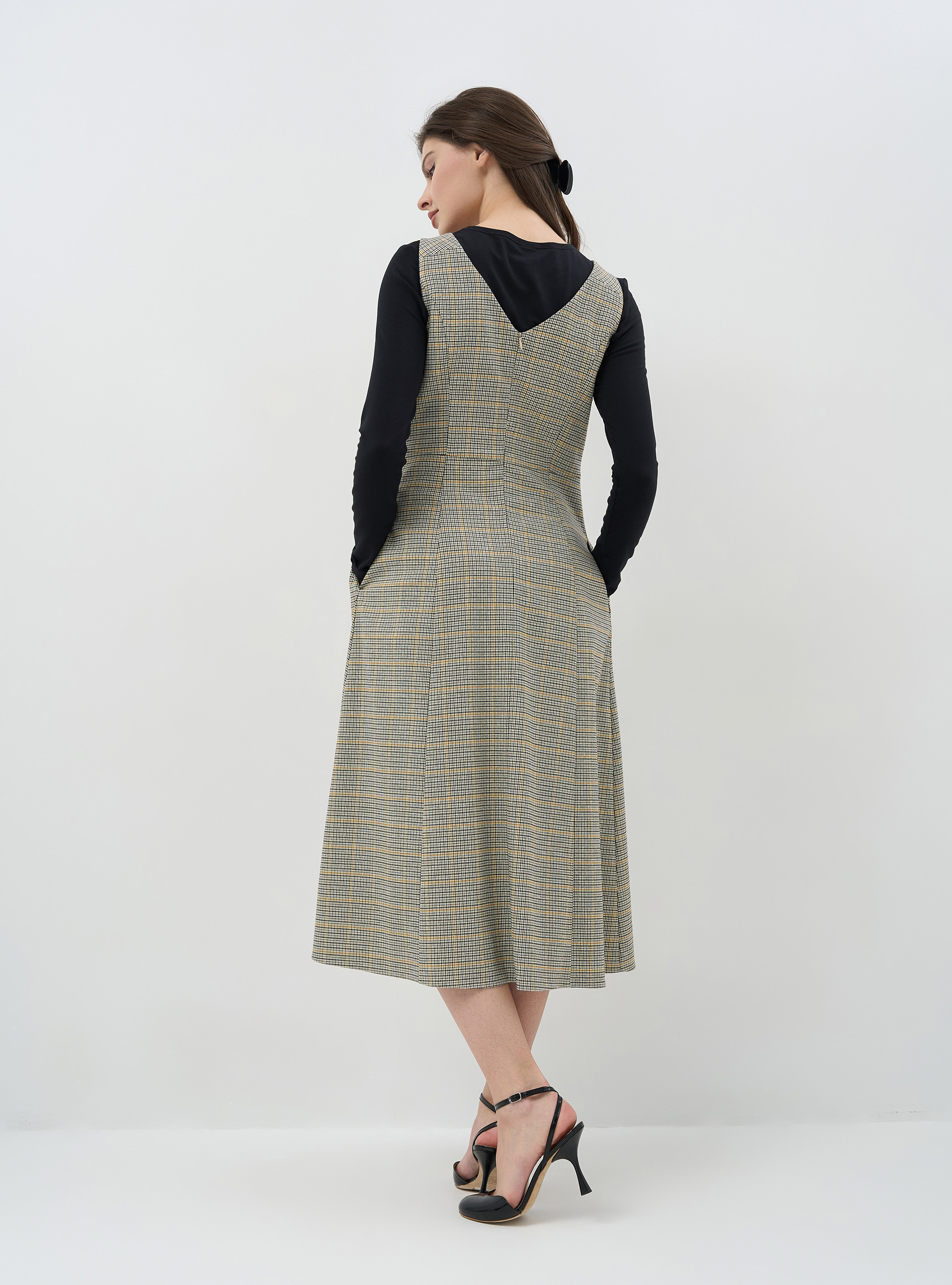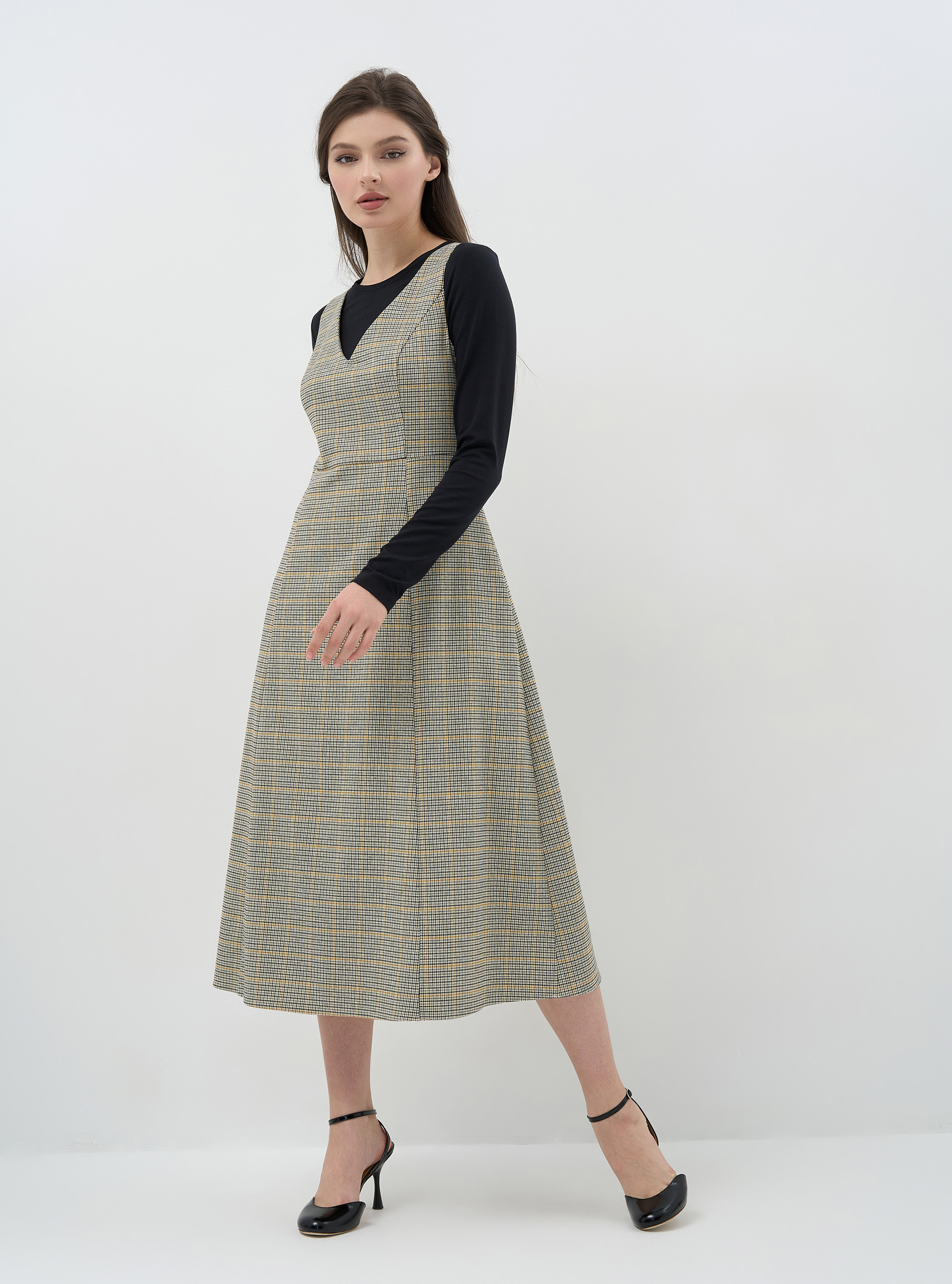 Платье-сарафан в клетку, из костюмной ткани, отрезная линия талии, без подклада. Рекомендуем комбинировать с водолазками, тонкими лонгсливами и рубашками со втачным рукавом.
