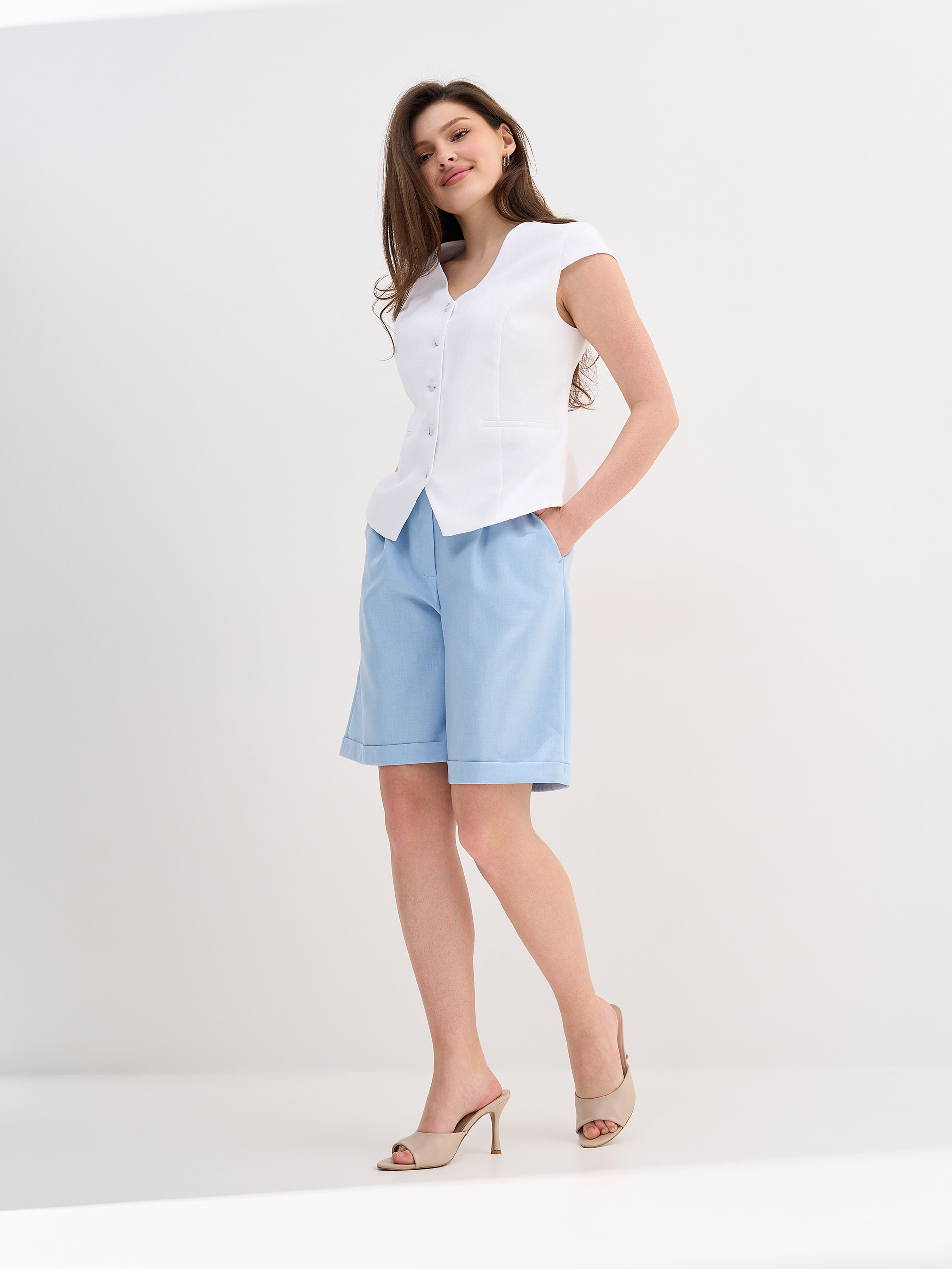 Шорты с защипами и манжетами по низу, длина до середины бедра. Смесовая с хлопком ткань.
