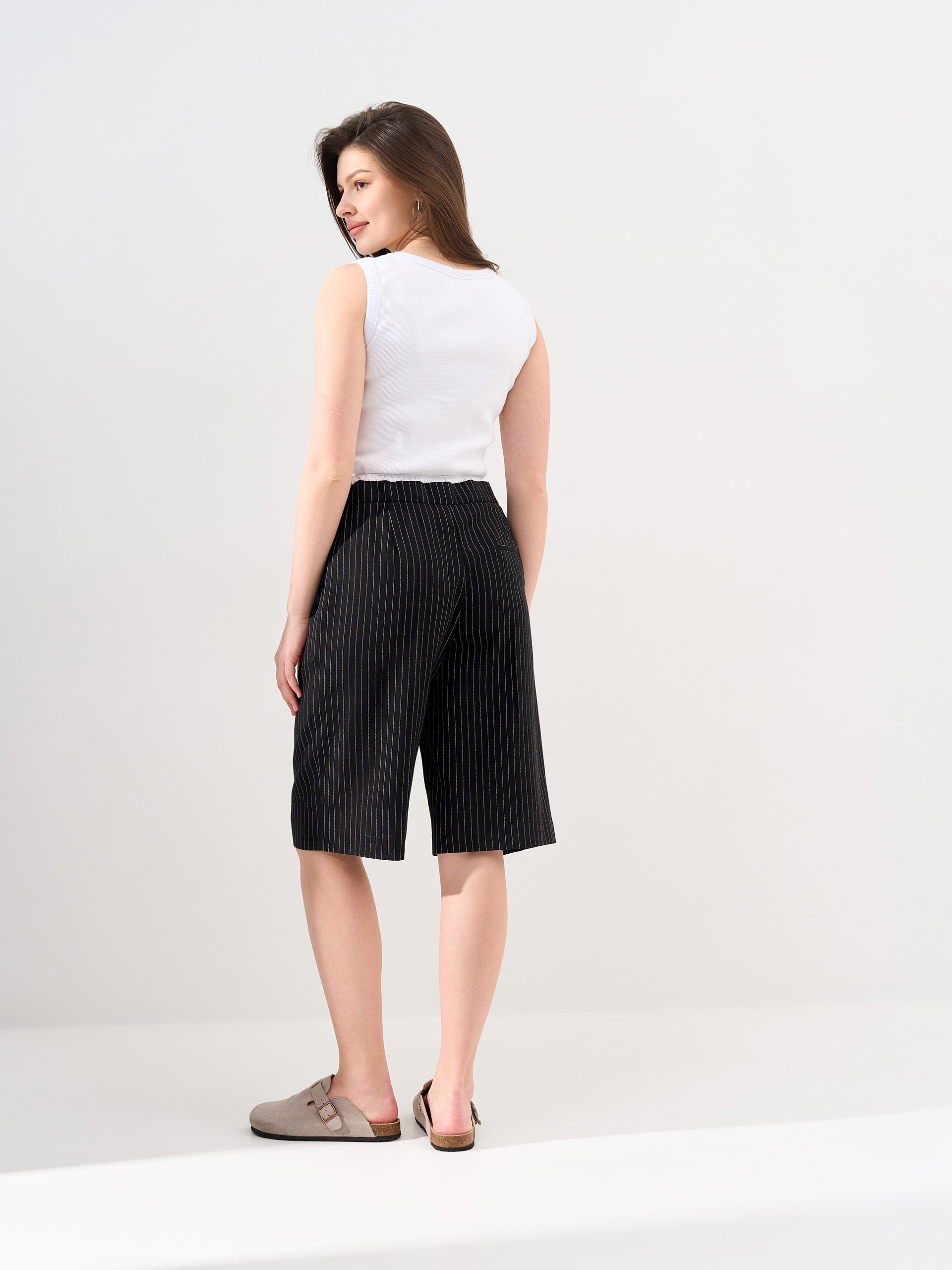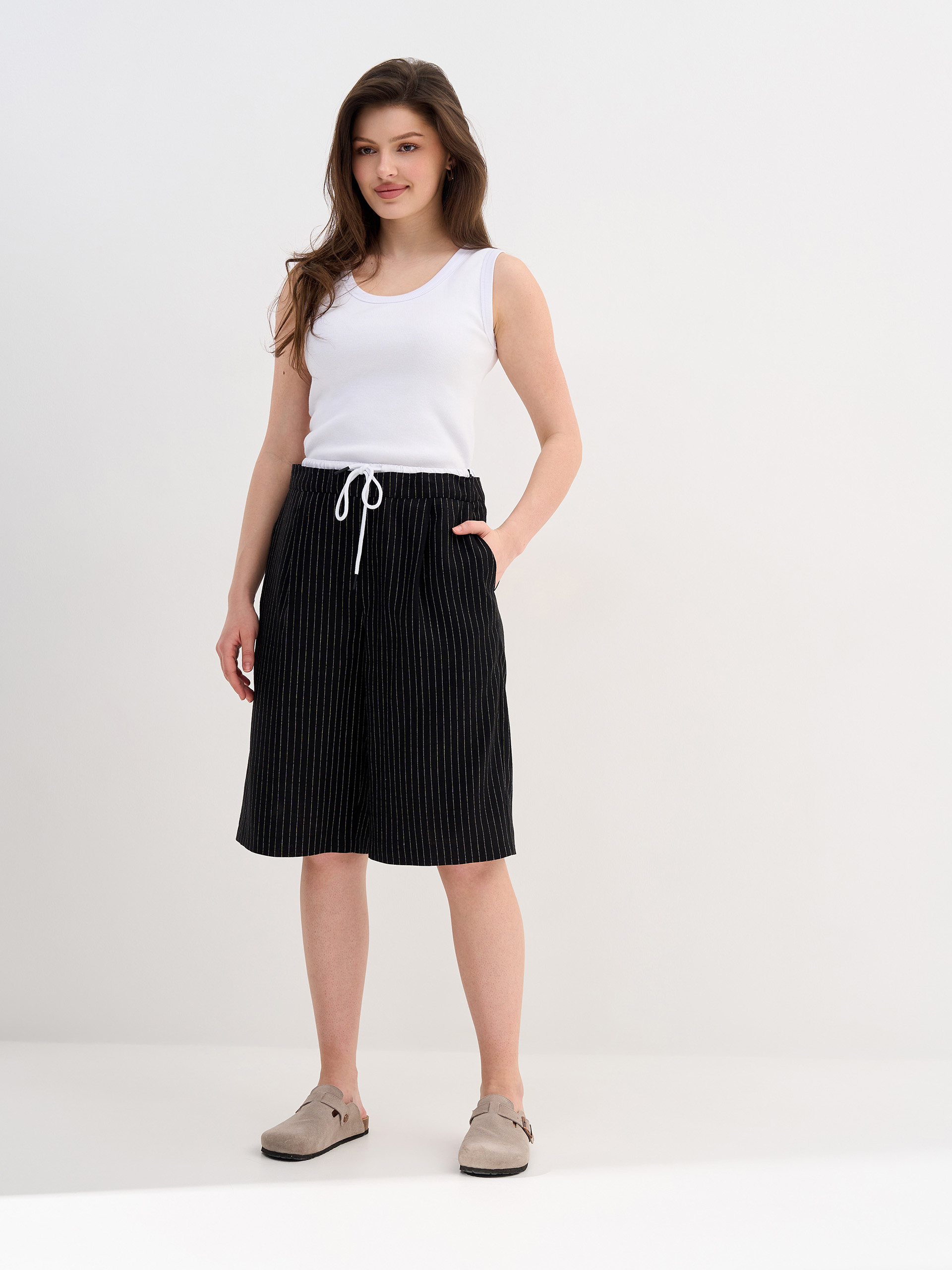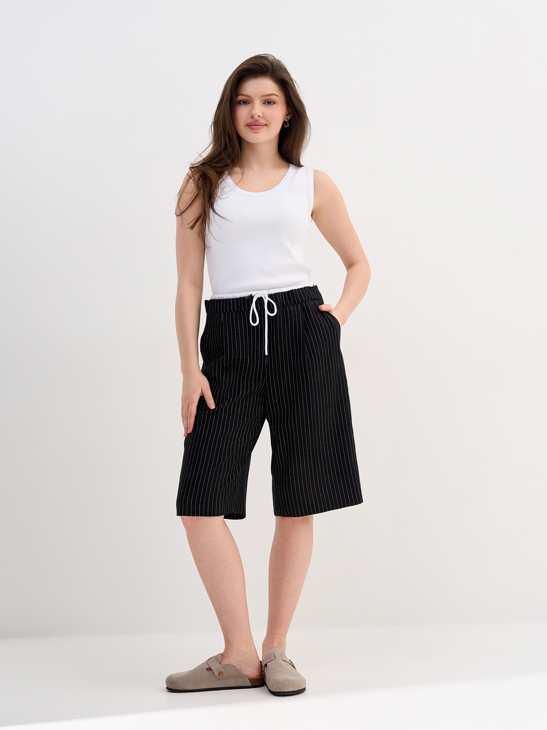 Шорты-бермуды  из смесового льна, прямые, небольшие защипы, пояс двойной, с контрастной отделкой и кулиской.