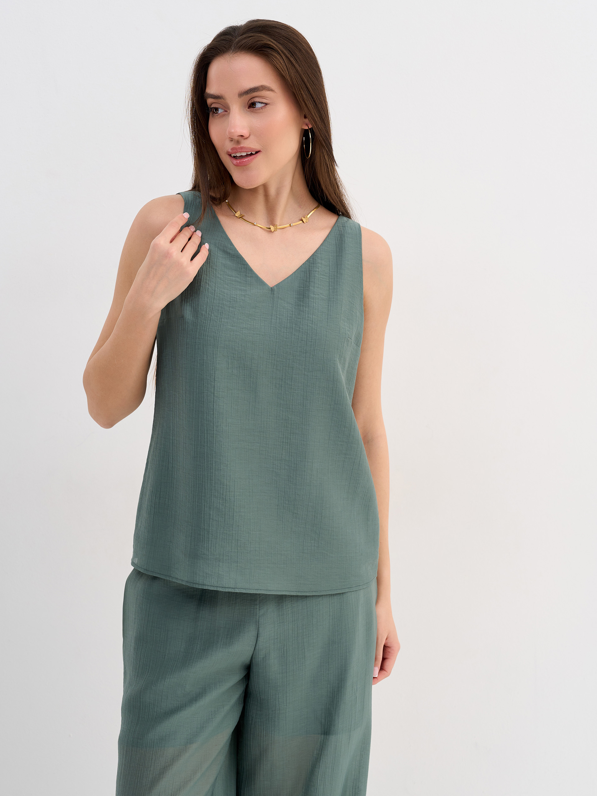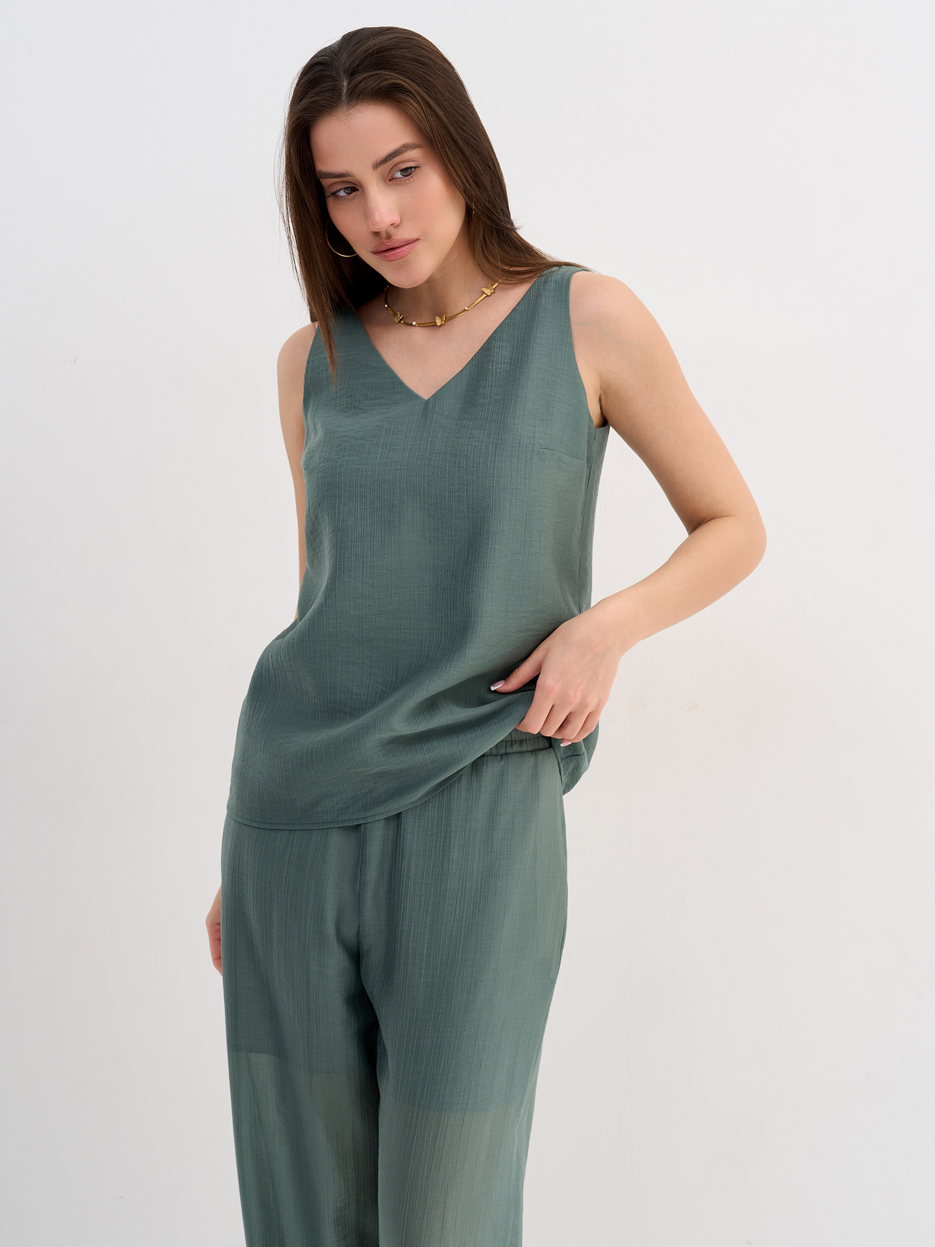 Топ из легкой воздушной фактурной вискозы малахитового цвета.