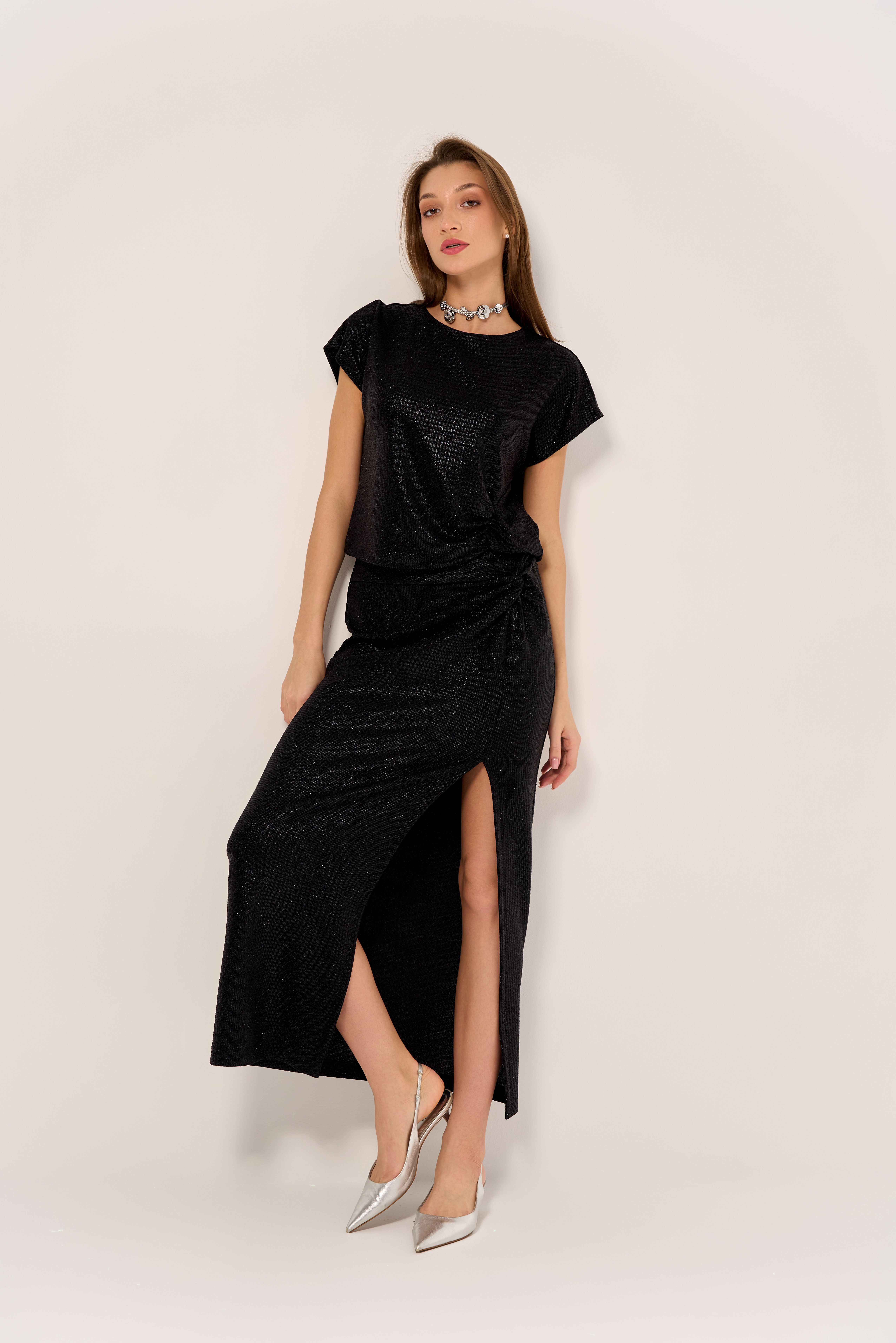 Топ из трикотажа с легким блеском, спереди декоративный подрез, приталенный.