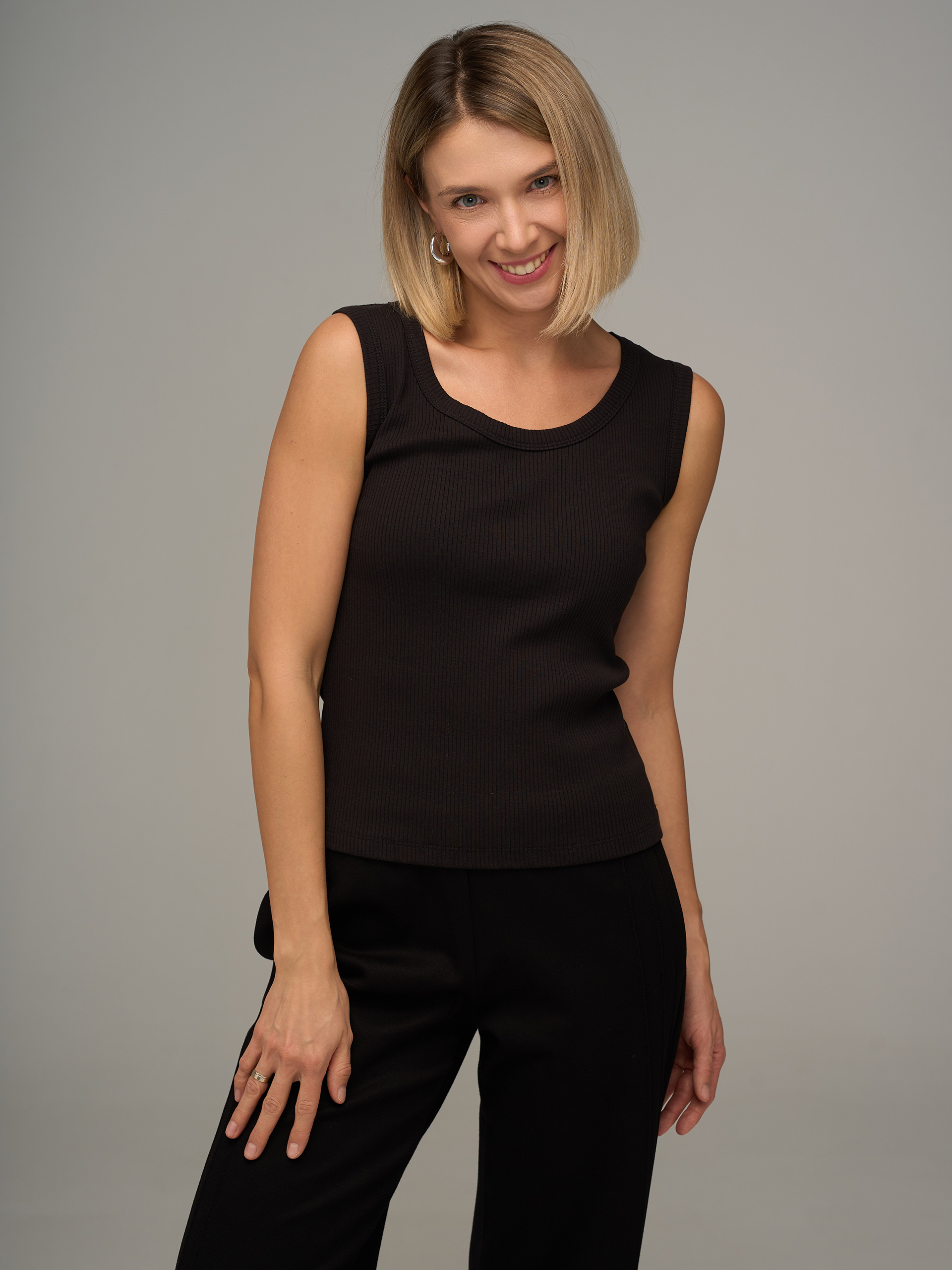 Базовая майка. Из хлопкового трикотажа в рубчик, достаточно плотного, чтобы держать форму, линия плеча и пройма аккуратно прикрывают, не оголяя лишнего.