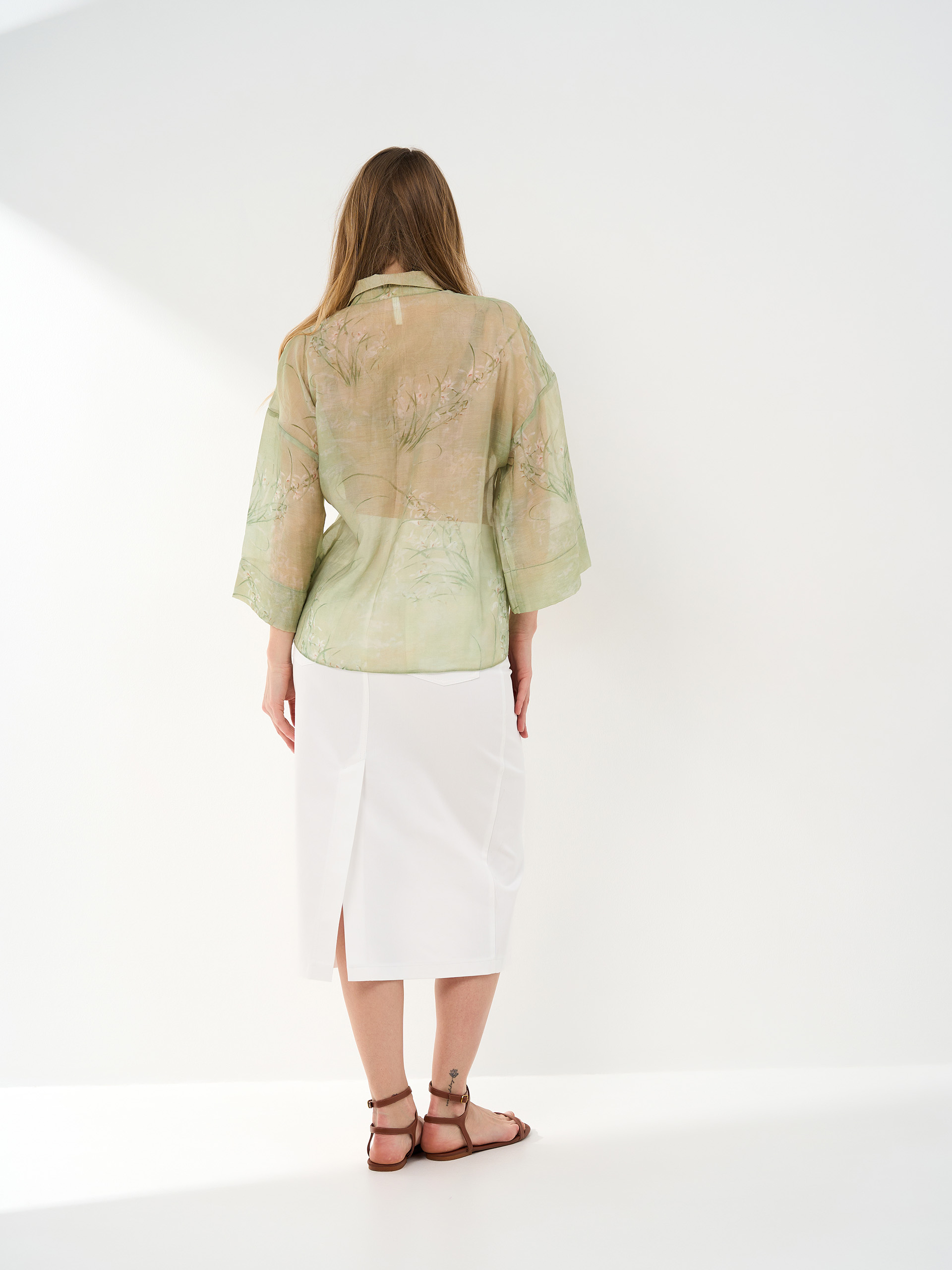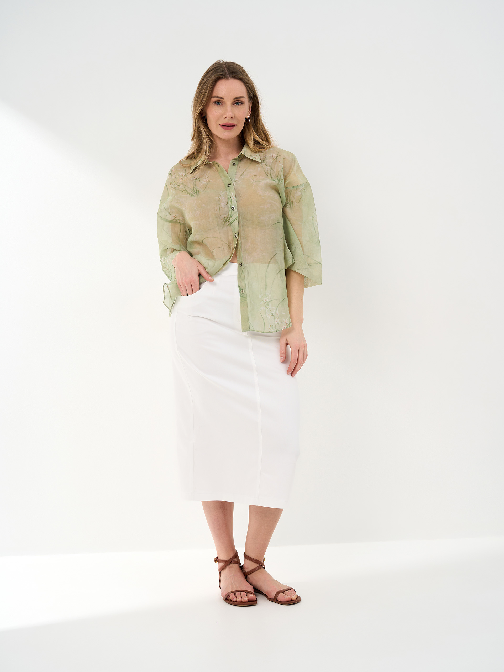 Юбка-карандаш, из хлопковой ткани под деним белого цвета. Сзади накладные карманы.