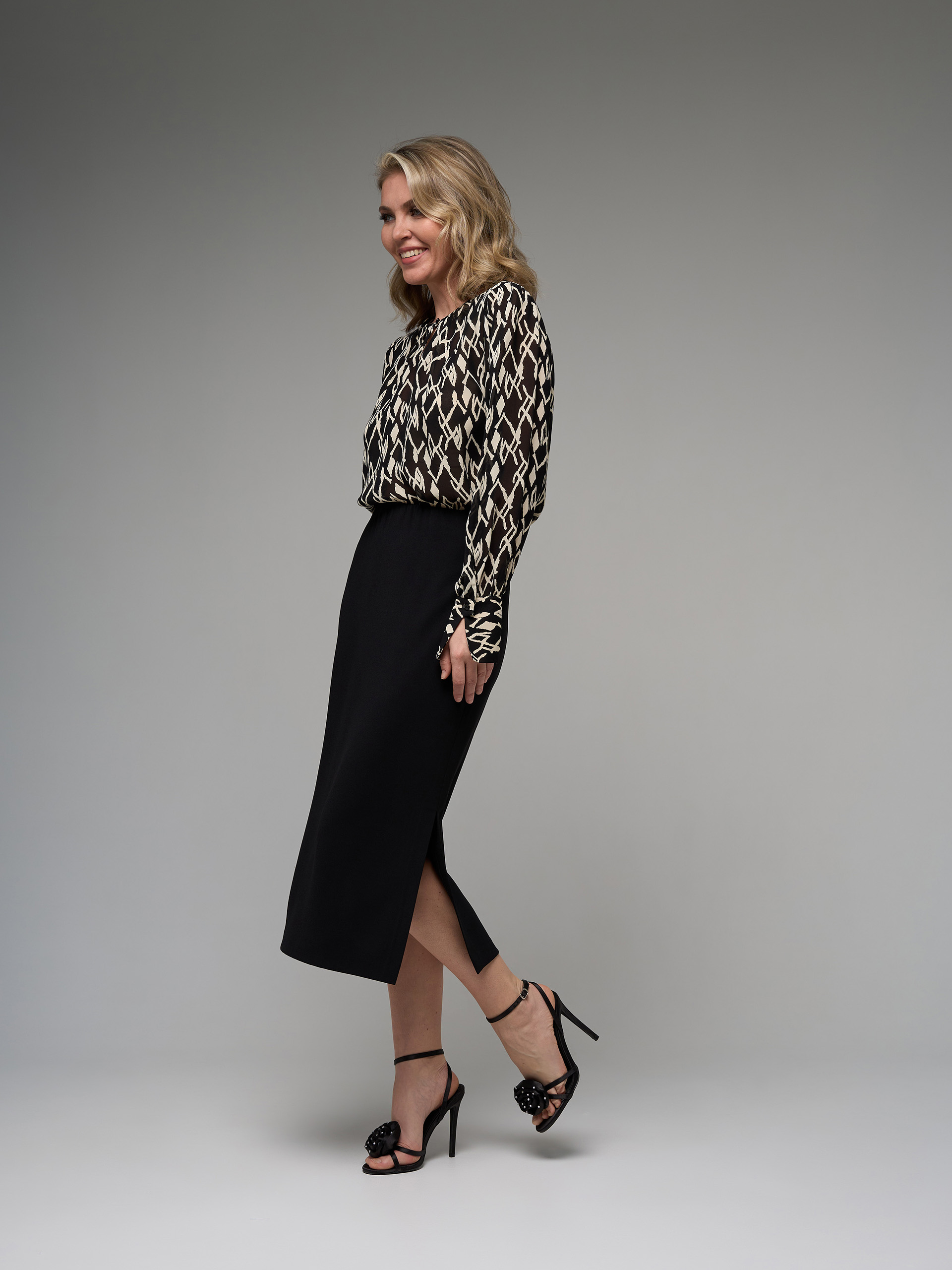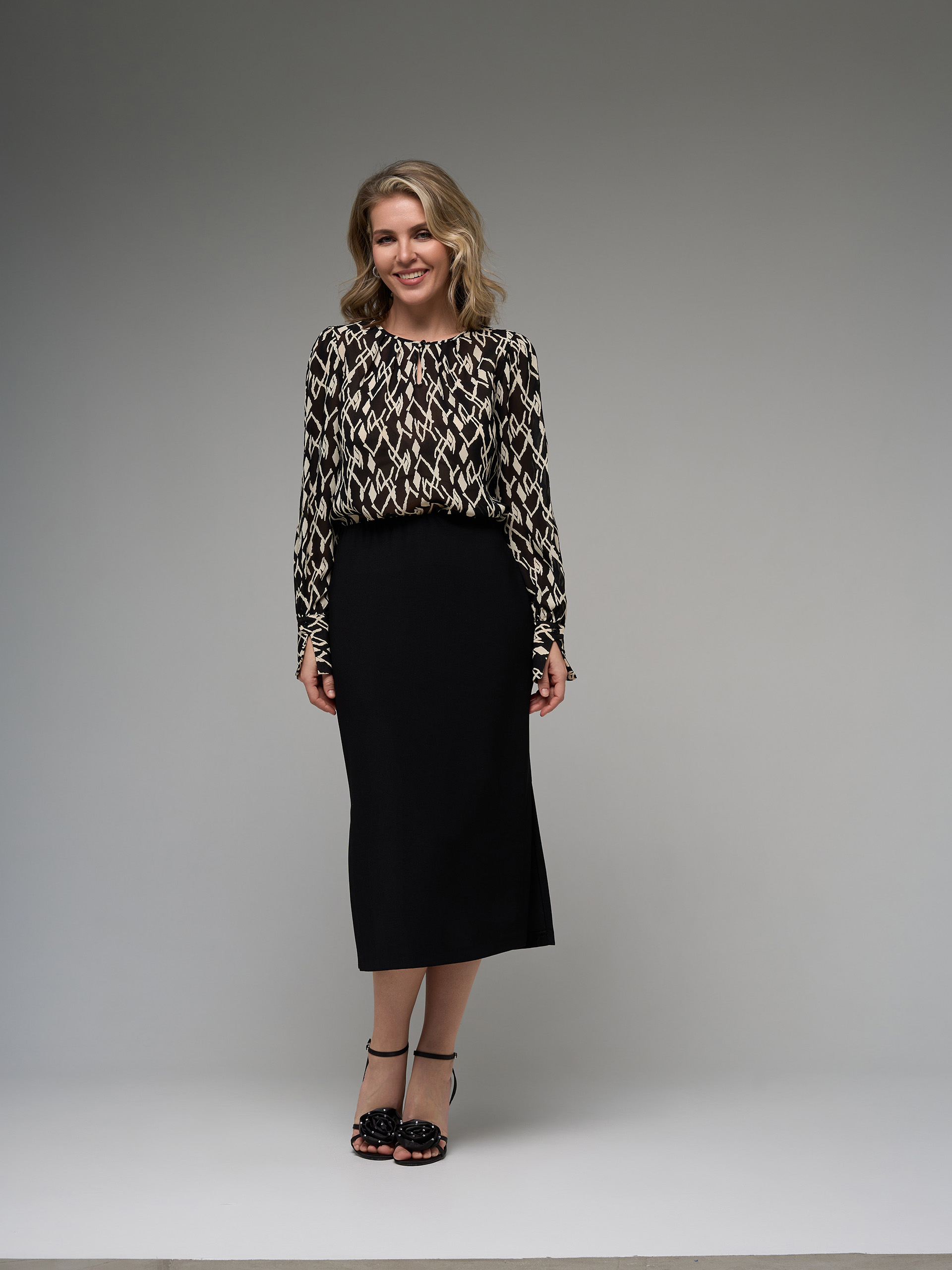 Юбка прямая, из струящегося крепа, прямого силуэта . Разрезы по бокам.