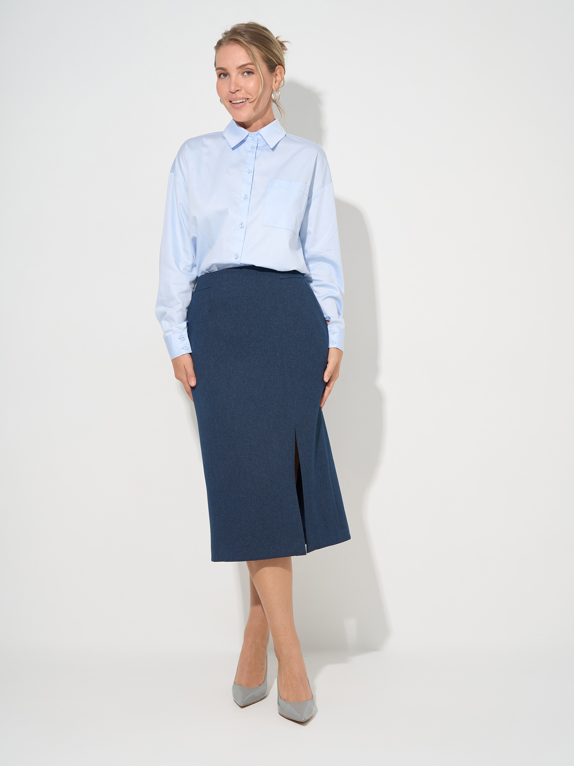 Юбка длиной ± 75 см, спереди рельеф с разрезом, карманы сбоку, в задней части пояса резинка, из мягкой теплой вискозной костюмной ткани в синюю мелкую клетку.