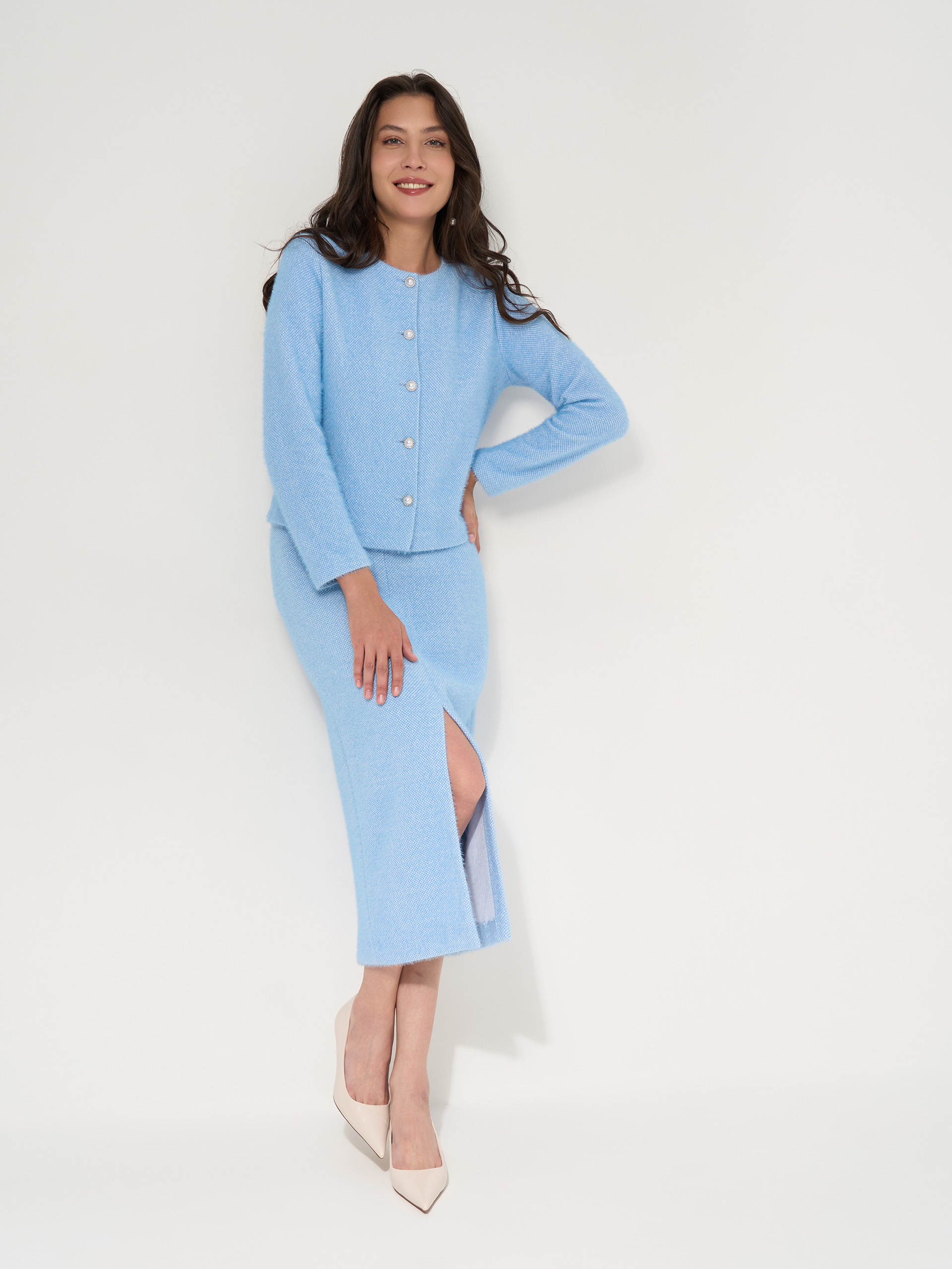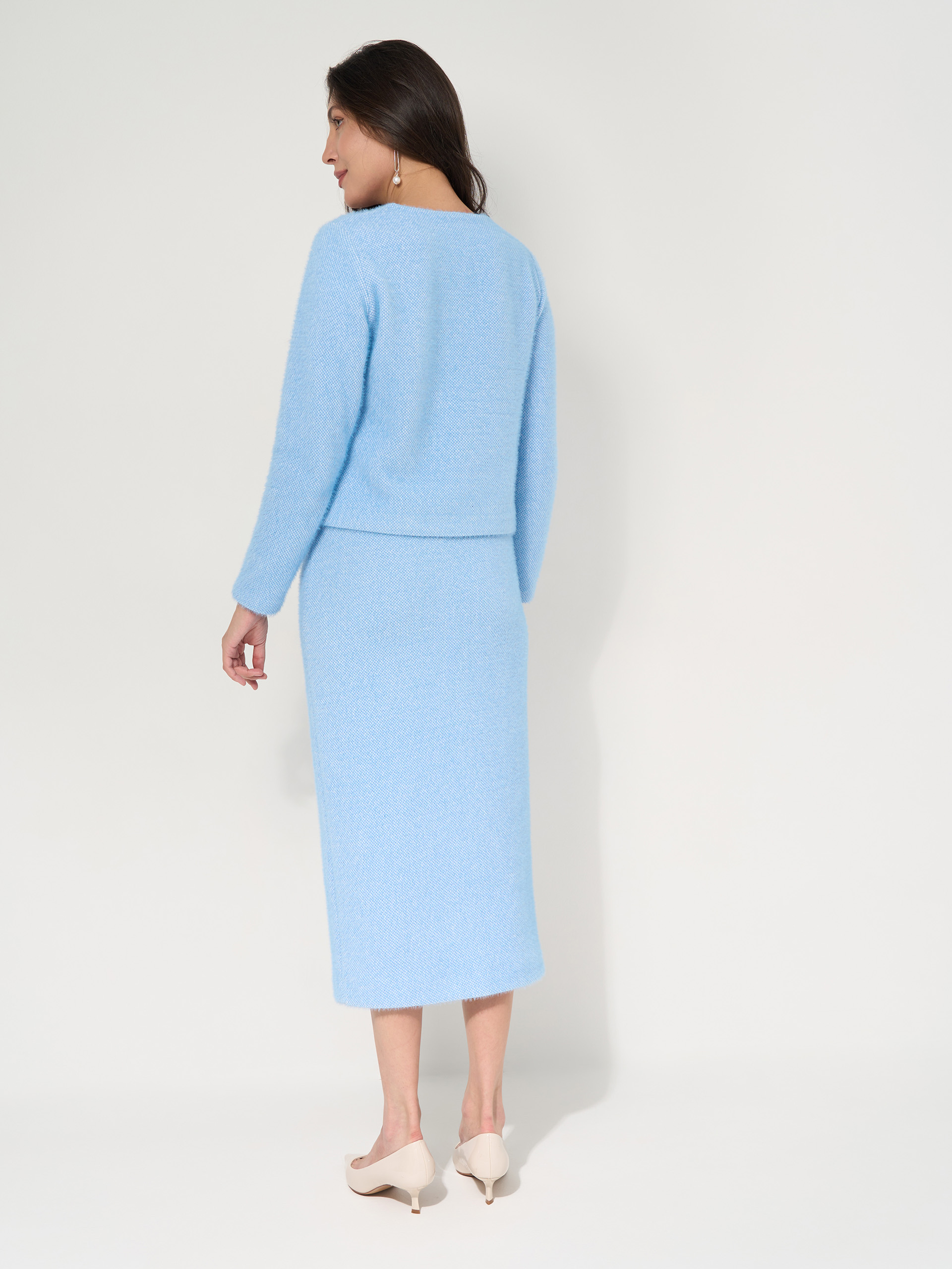 Юбка с разрезом спереди, в поясе резинка, вискозный нежный трикотаж, с подпушком. Цвет голубой меланж.