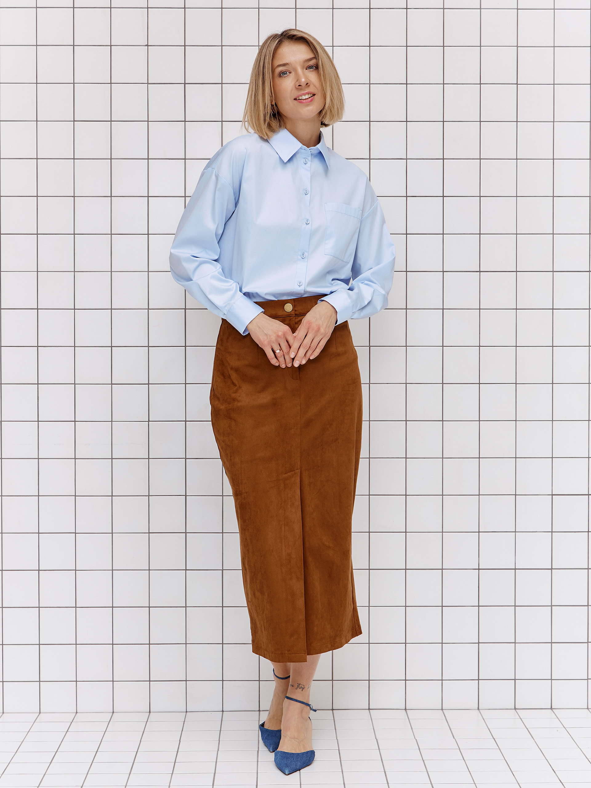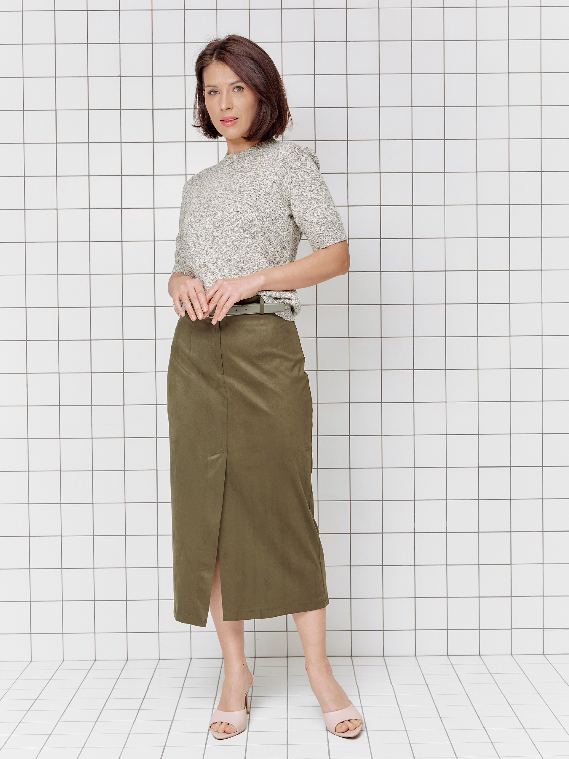 Юбка-миди, прямая, из пластичной ткани с эффектом замши, с подкдадом.