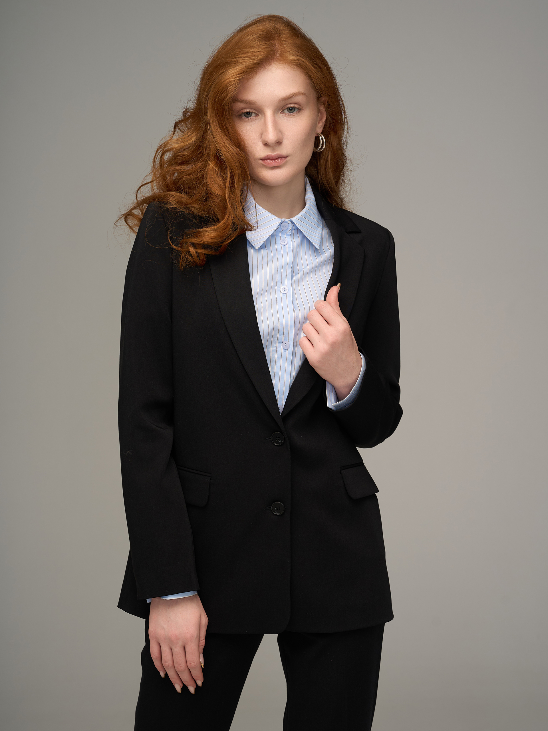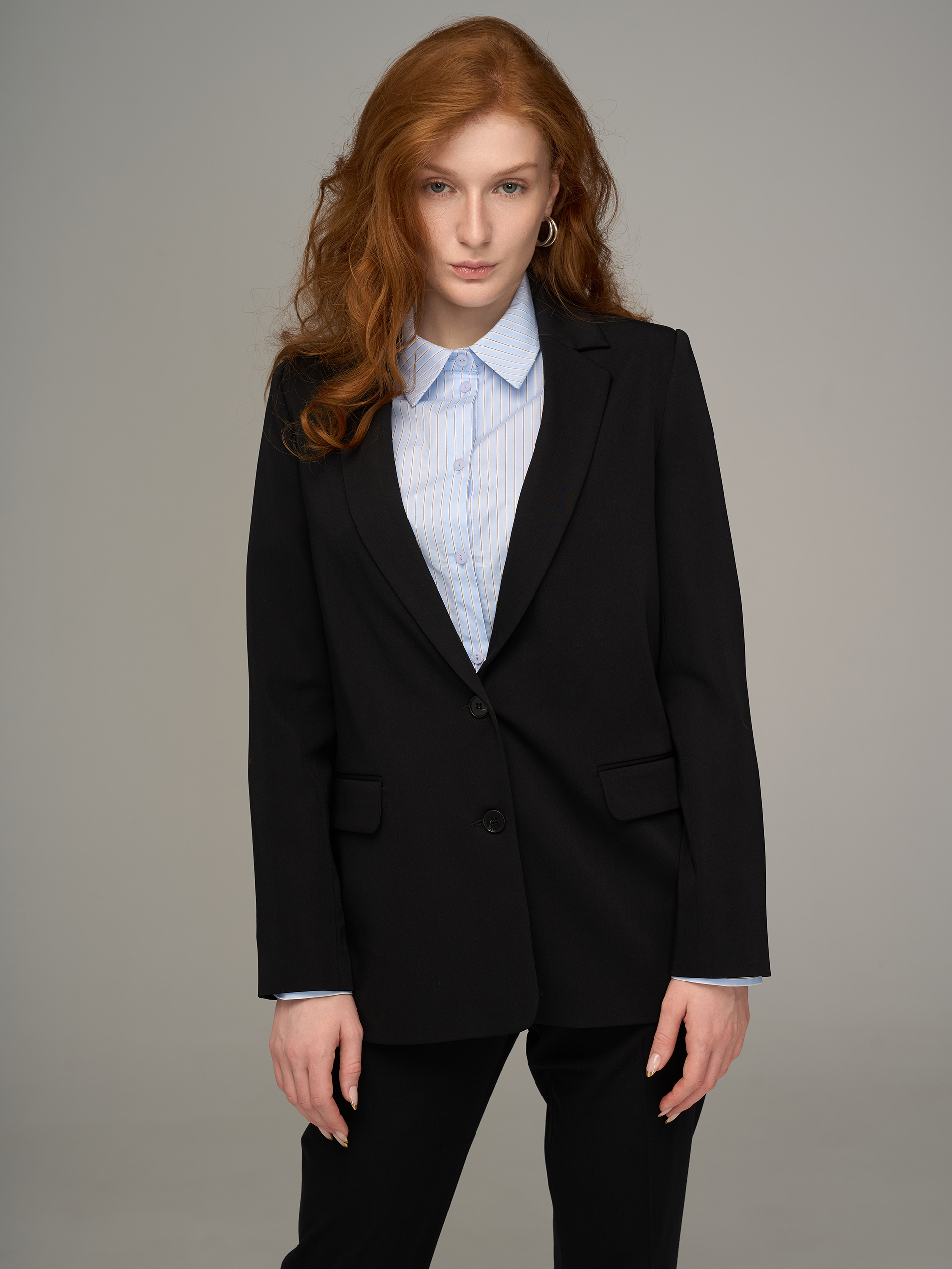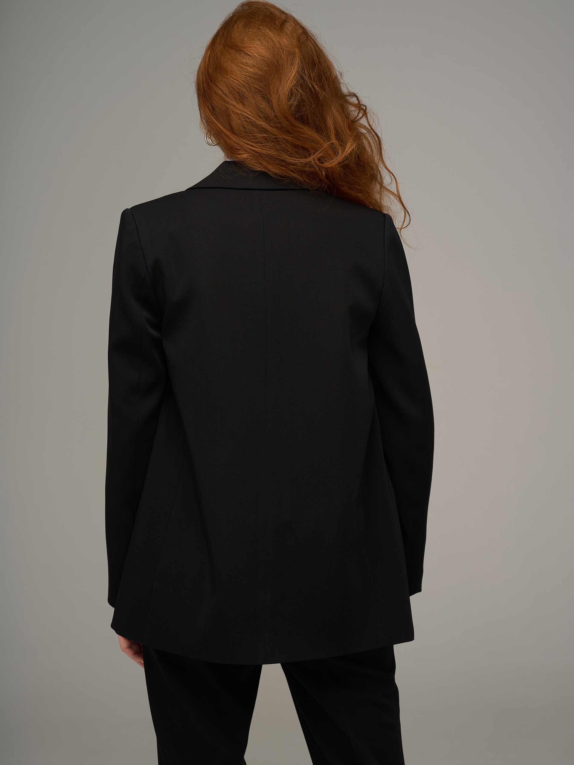 Жакет среднего объема, слегка приталенный, на подкладе. Из вискозной костюмной гладкоокрашенной ткани, черного цвета.