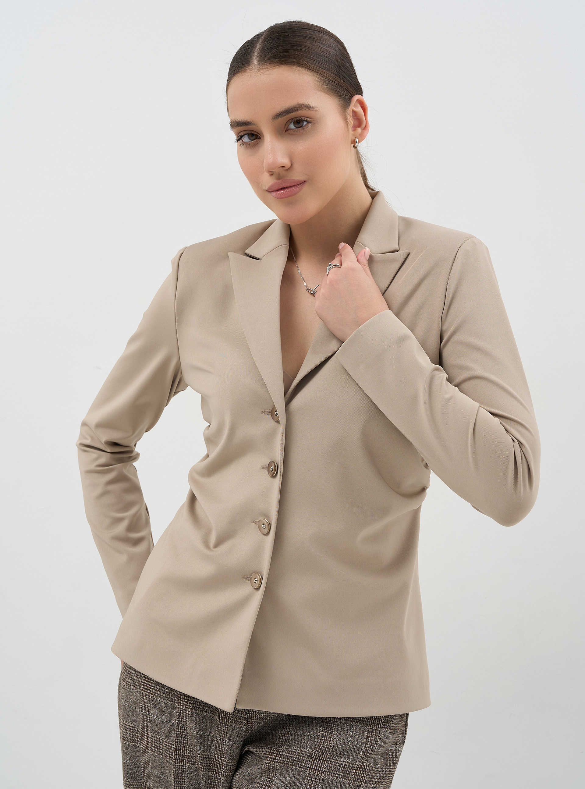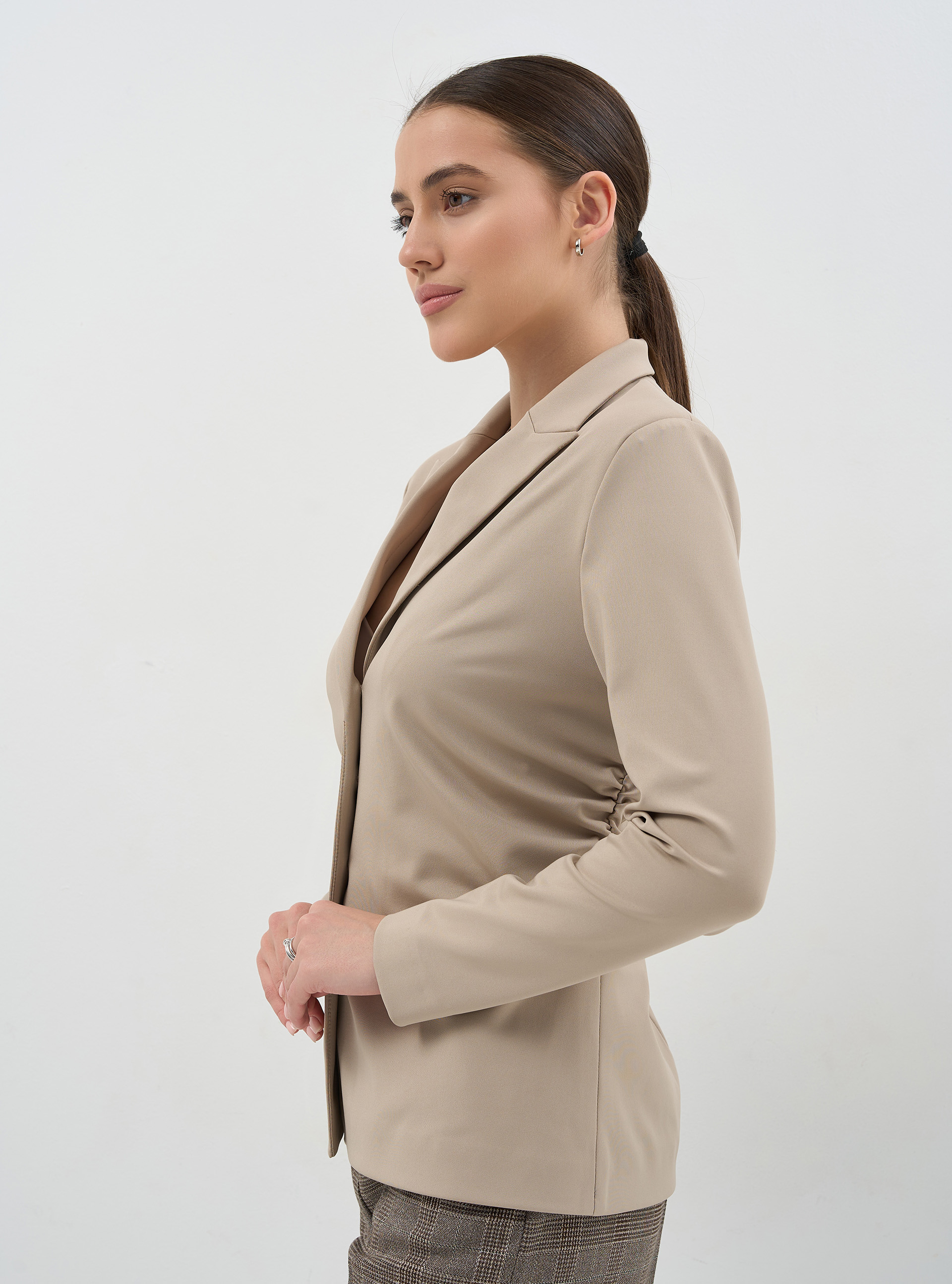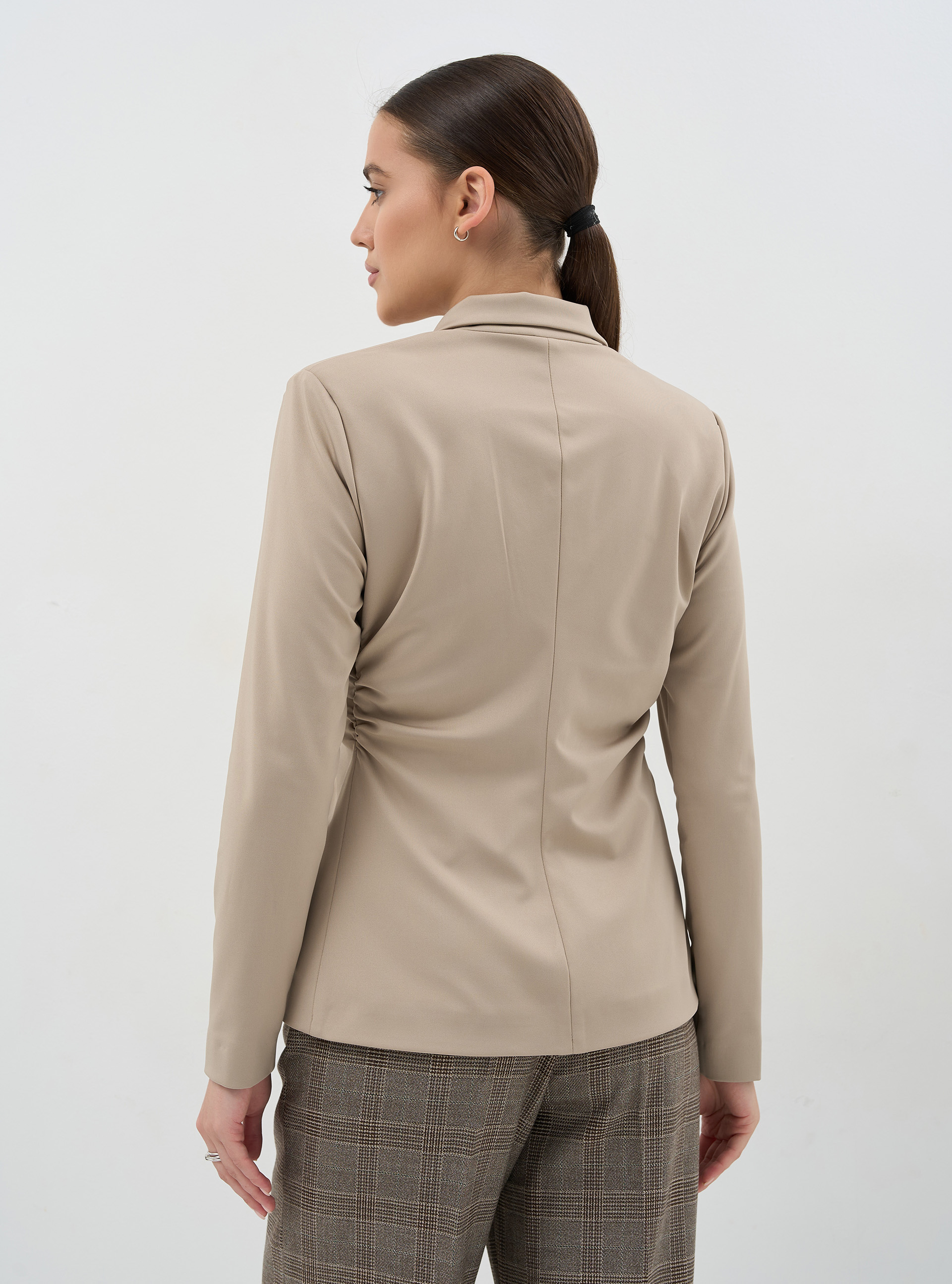 Приталенный жакет, заталенный жакет-кардиган из трикотажа, по фактуре напоминающего неопрен. По боковому шву сборка, подклад частичный на верхней части спинки.