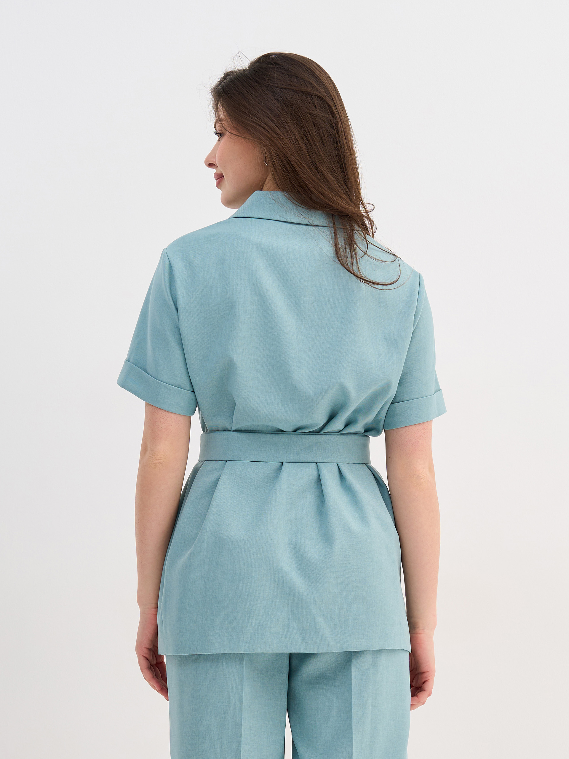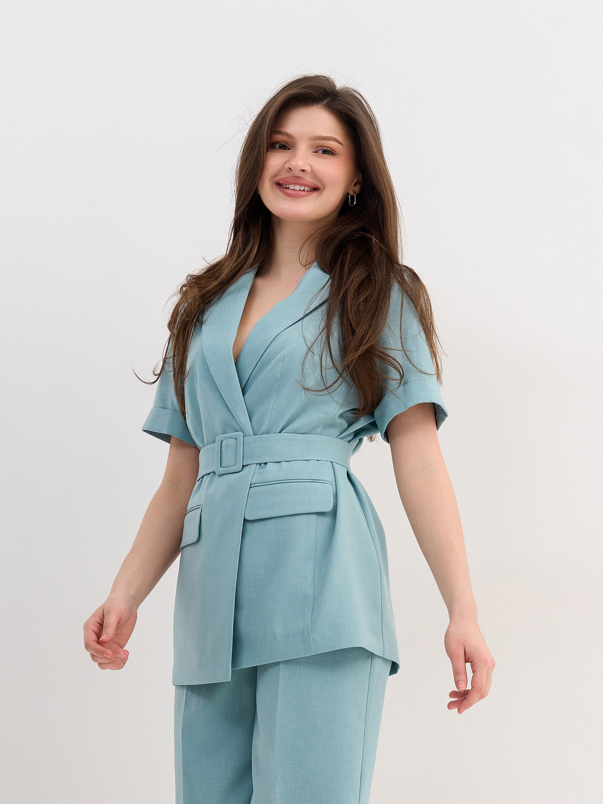 Жакет из смесовой ткани, с короткими рукавами, облегченный, без подклада, в комплекте текстильный ремень с пряжкой.