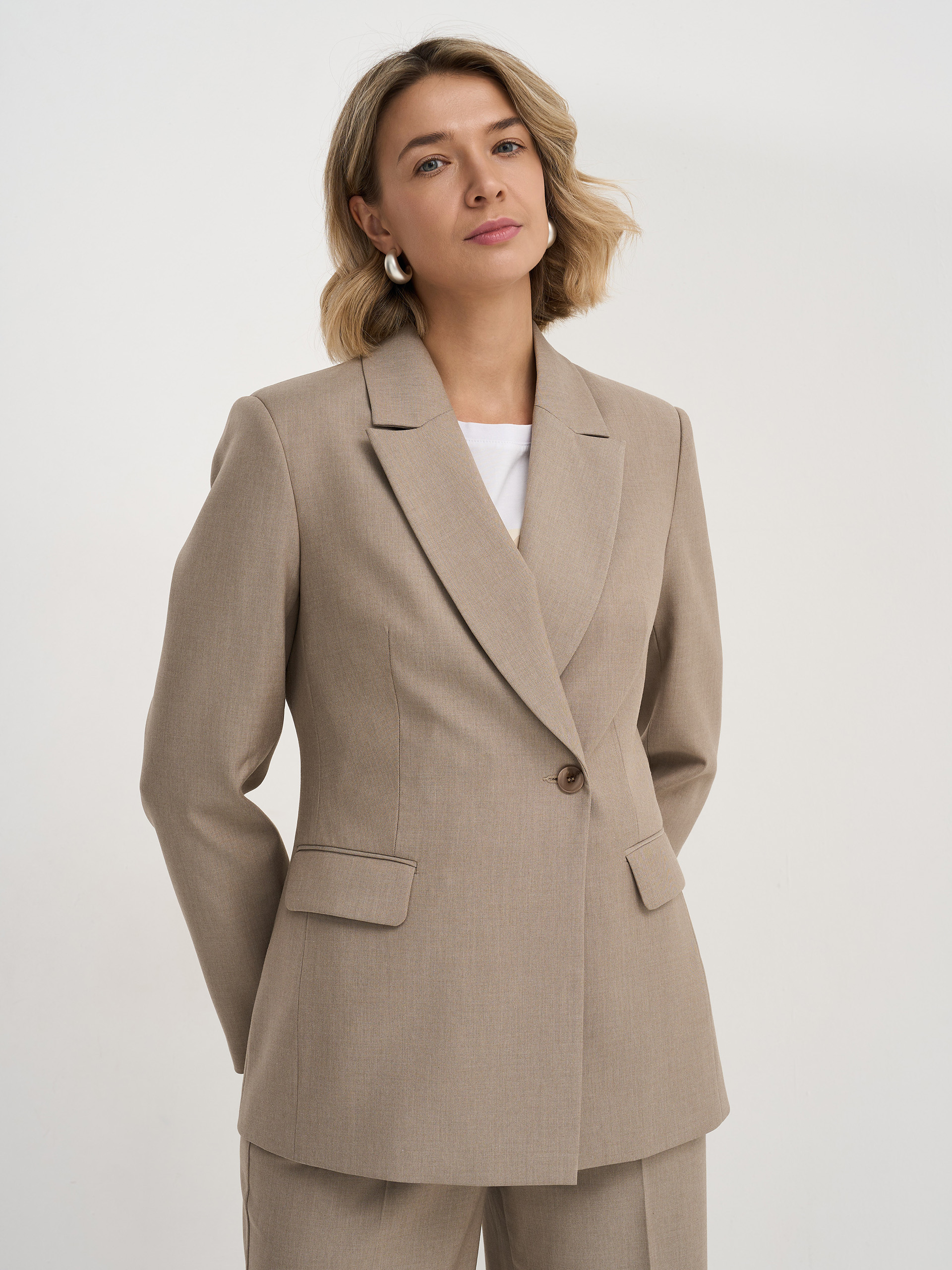 Жакет полуприлегающего силуэта, из гладкой костюмной ткани содержащей шерсть бежевого цвета, английский воротник, двубортный с застежкой на одну пуговицу, на подкладе.