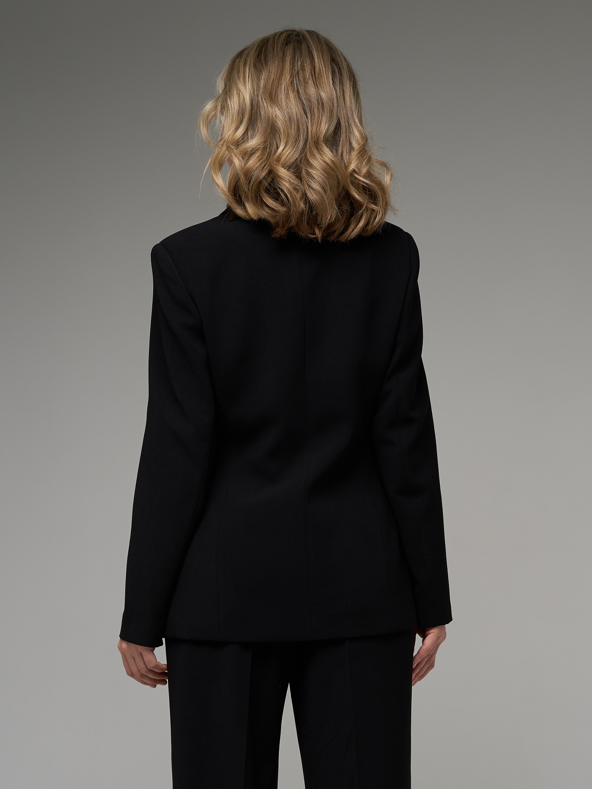 Жакет, приталенного силуэта, с крупными лацканами, визуально вытягивающий фигуру, формирующий силуэт  "песочные часы", из благородной креповой ткани, на подкладе.