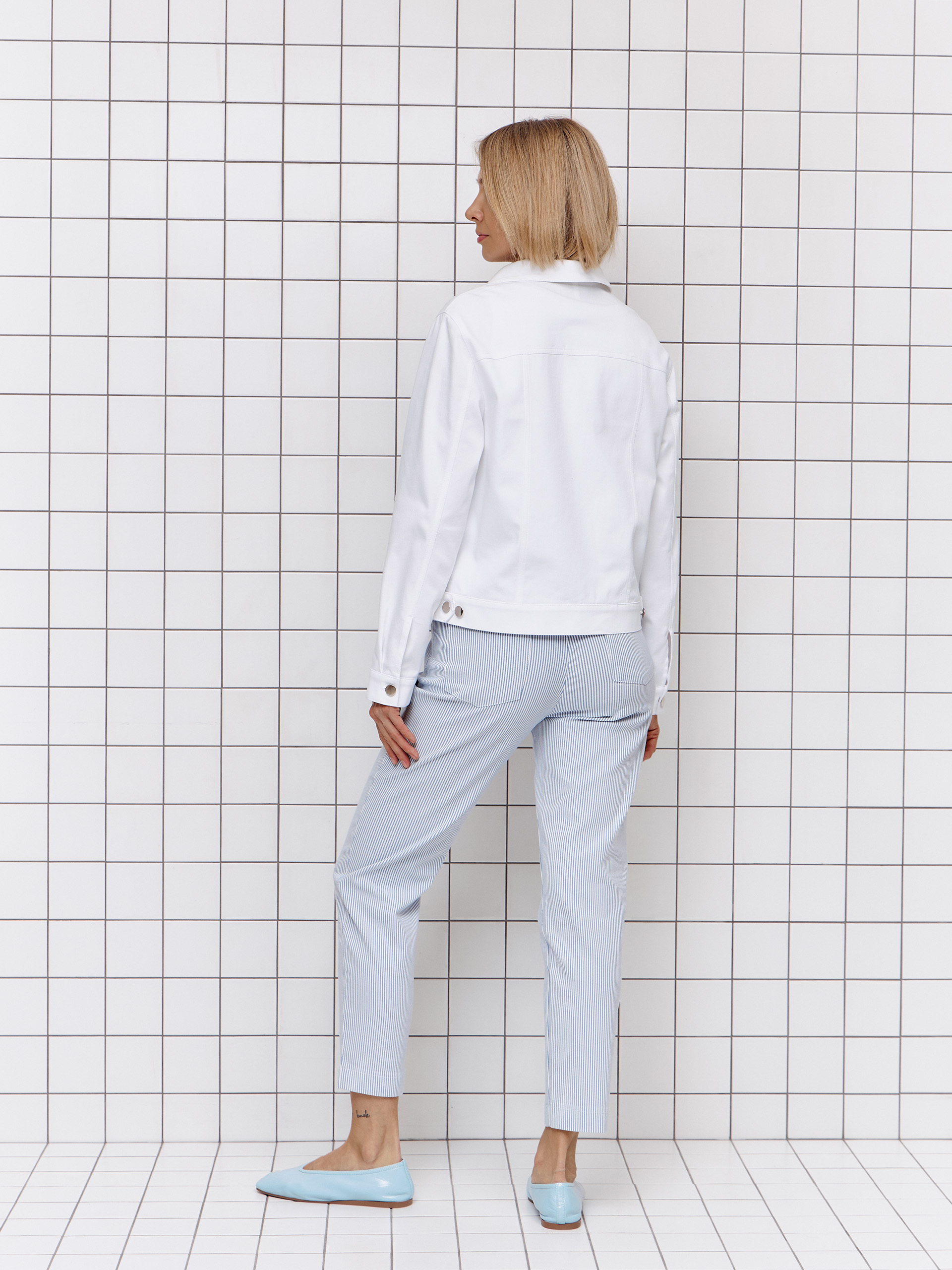 Жакет в стиле джинсовки, из хлопковой ткани цвет экрю, без подклада, втачные рукава с манжето, сбоку паты для регулирования ширины низа.