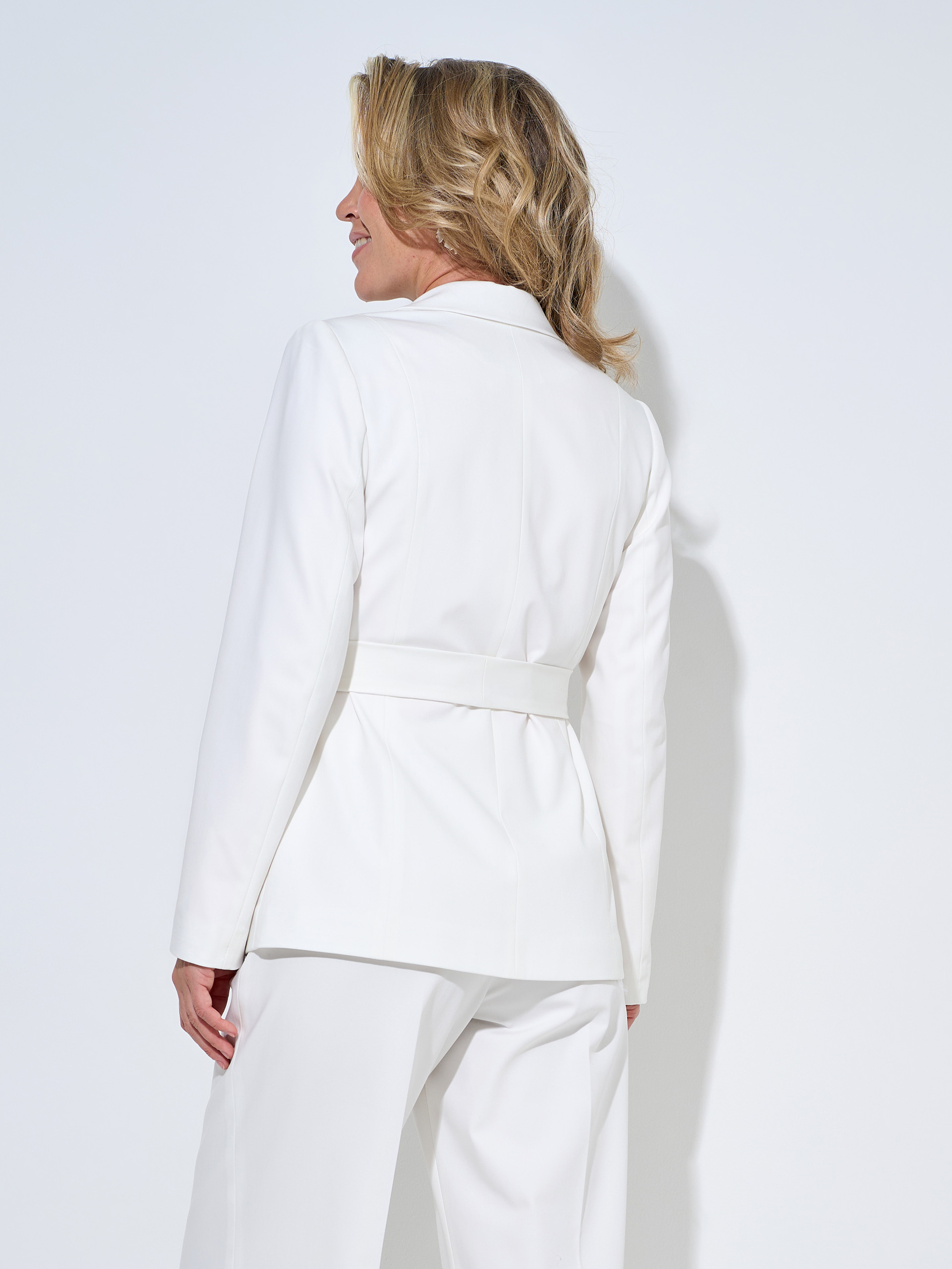 Приталенный жакет на подкладе, классической длины, из гладкой плотной костюмной ткани, в комплекте текстильный пояс.