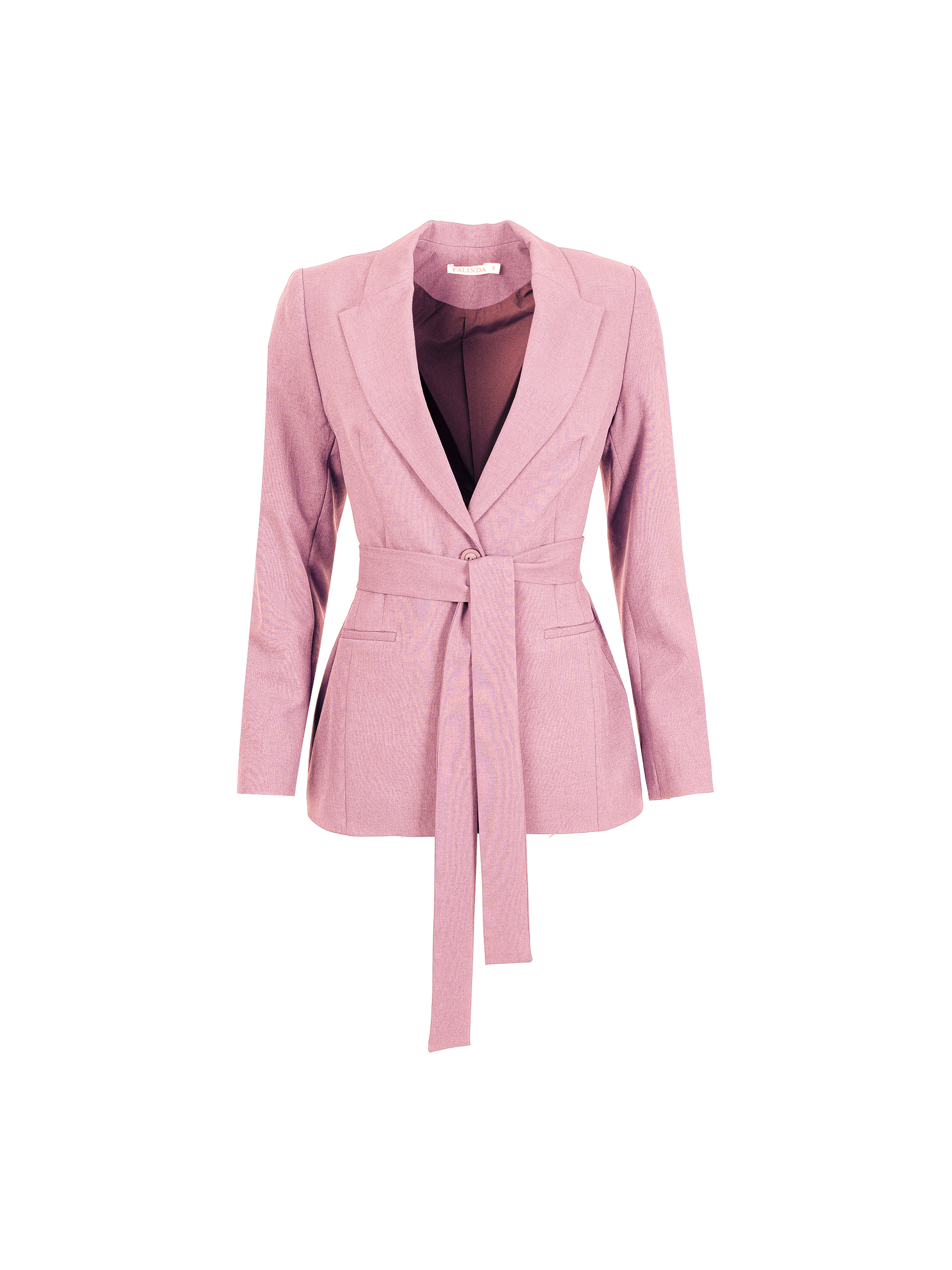 Жакет полуприлегающего силуэта с поясом, из костюмной ткани розового цвета, английский воротник, карманы в листочку, на подкладе.