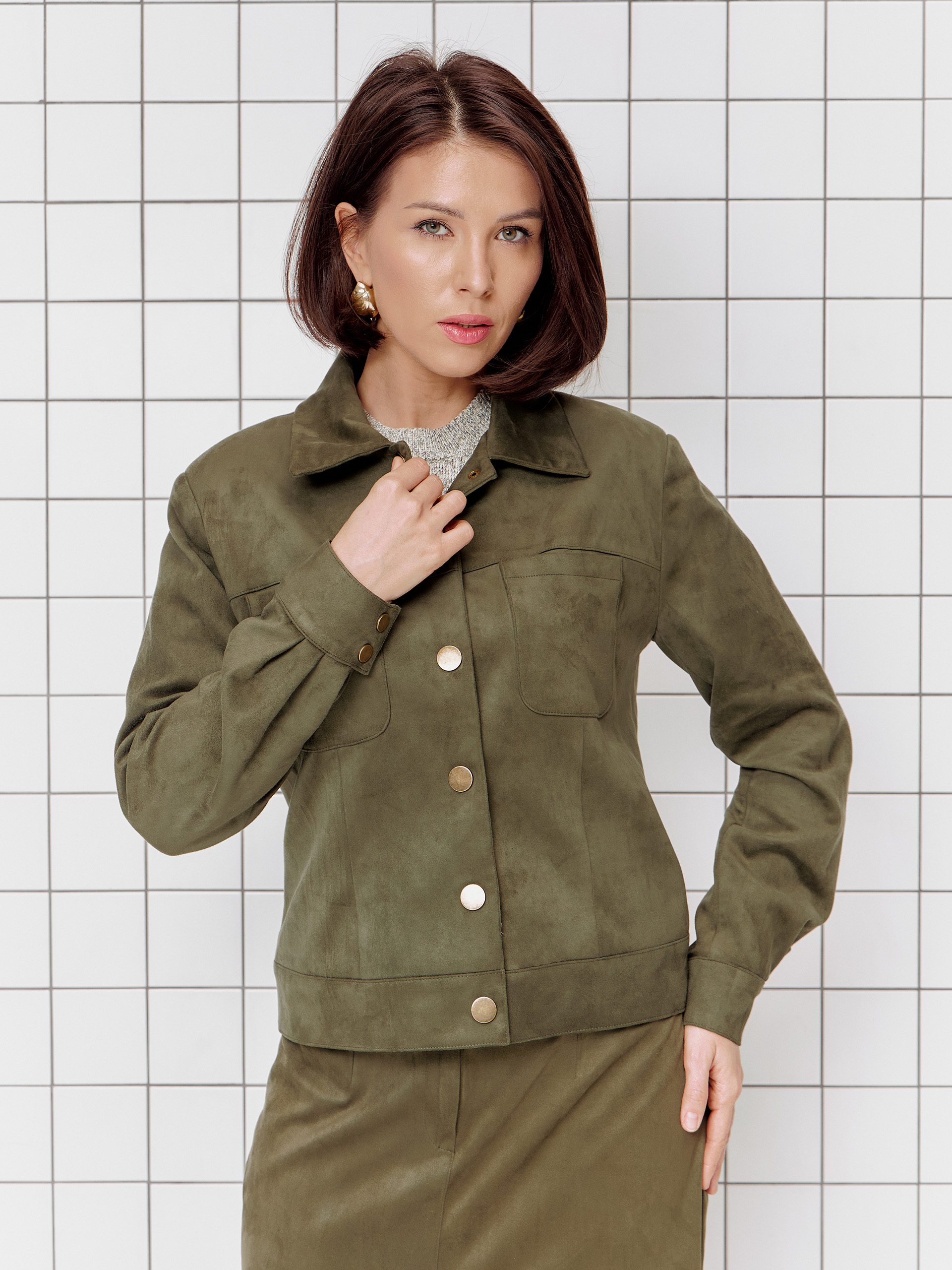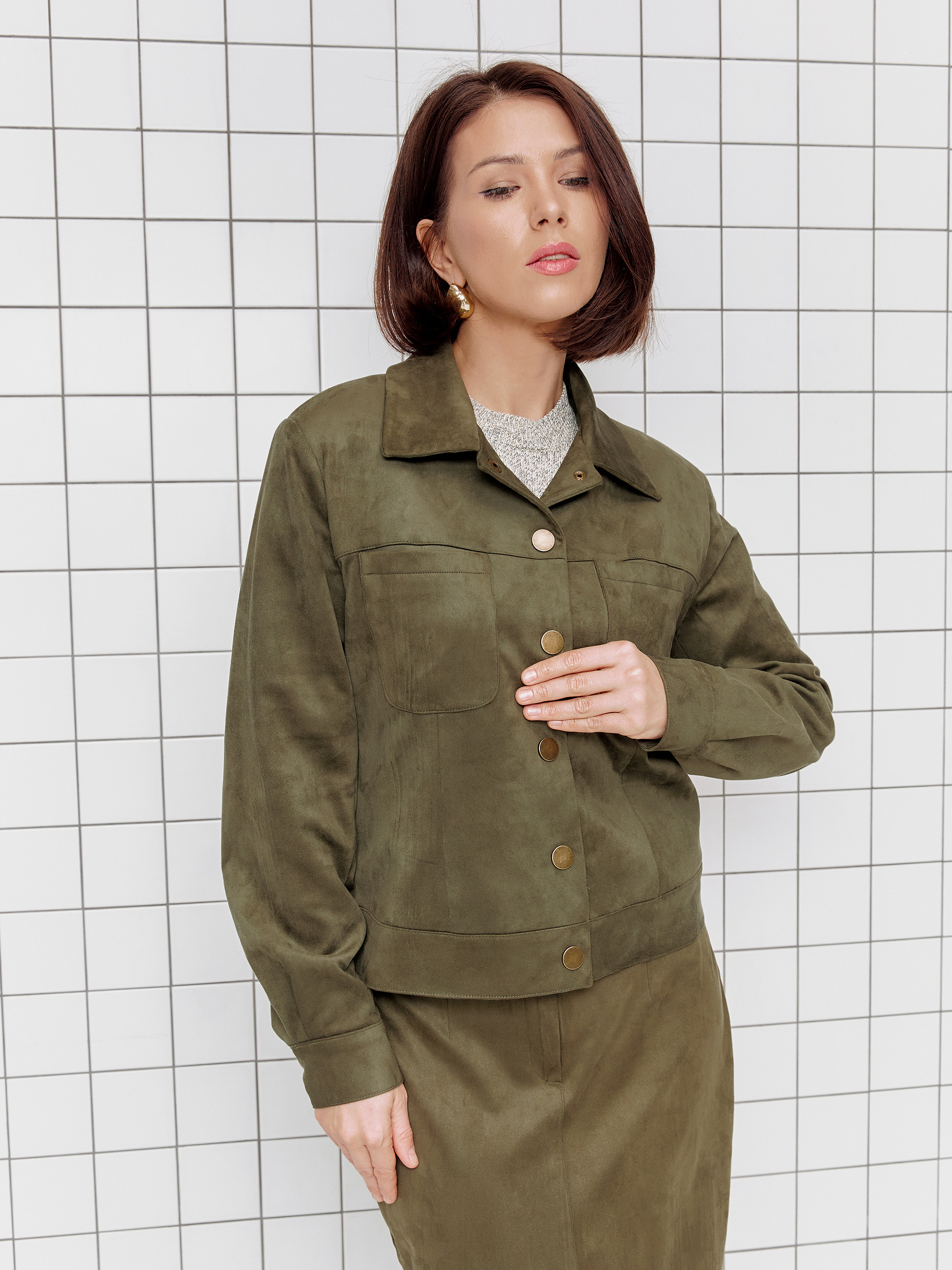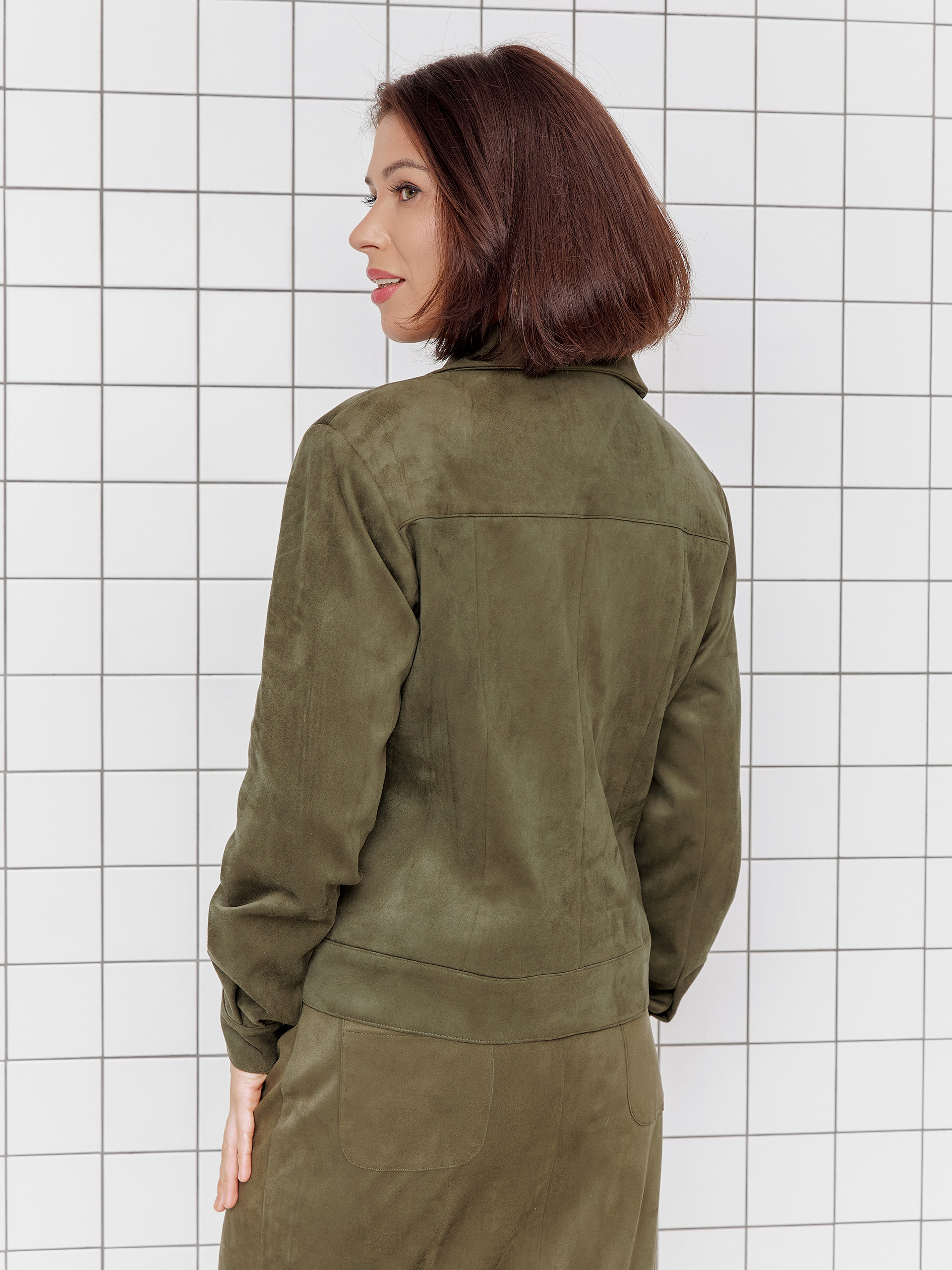 Жакет в стиле джинсовки, малый объем, втачной рукав, из мягкой пластичной ткани с эффектом замши.