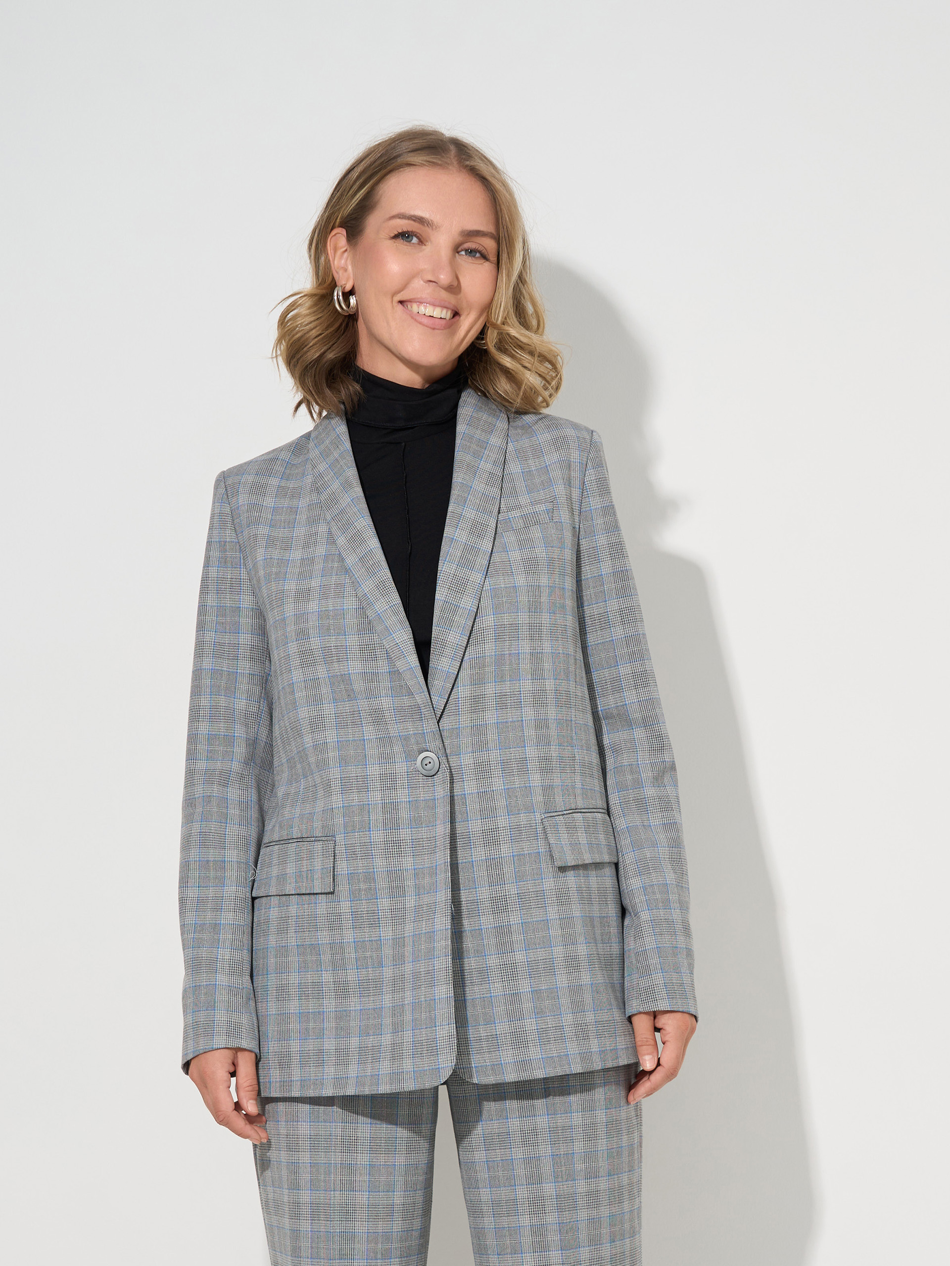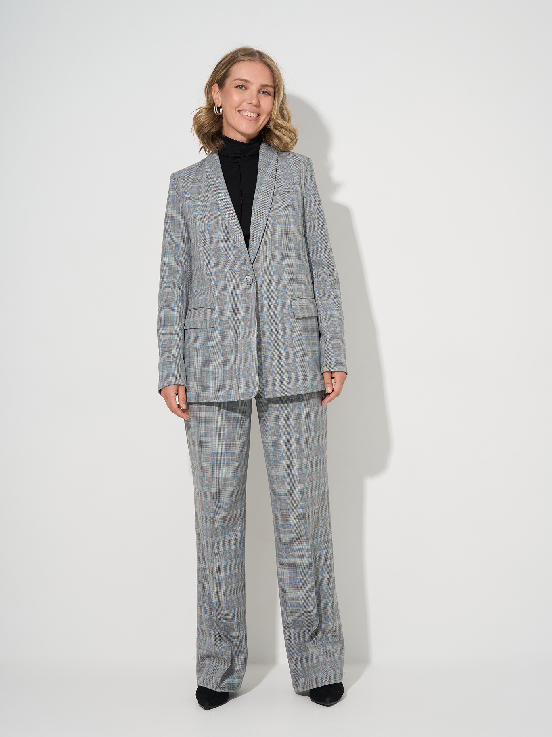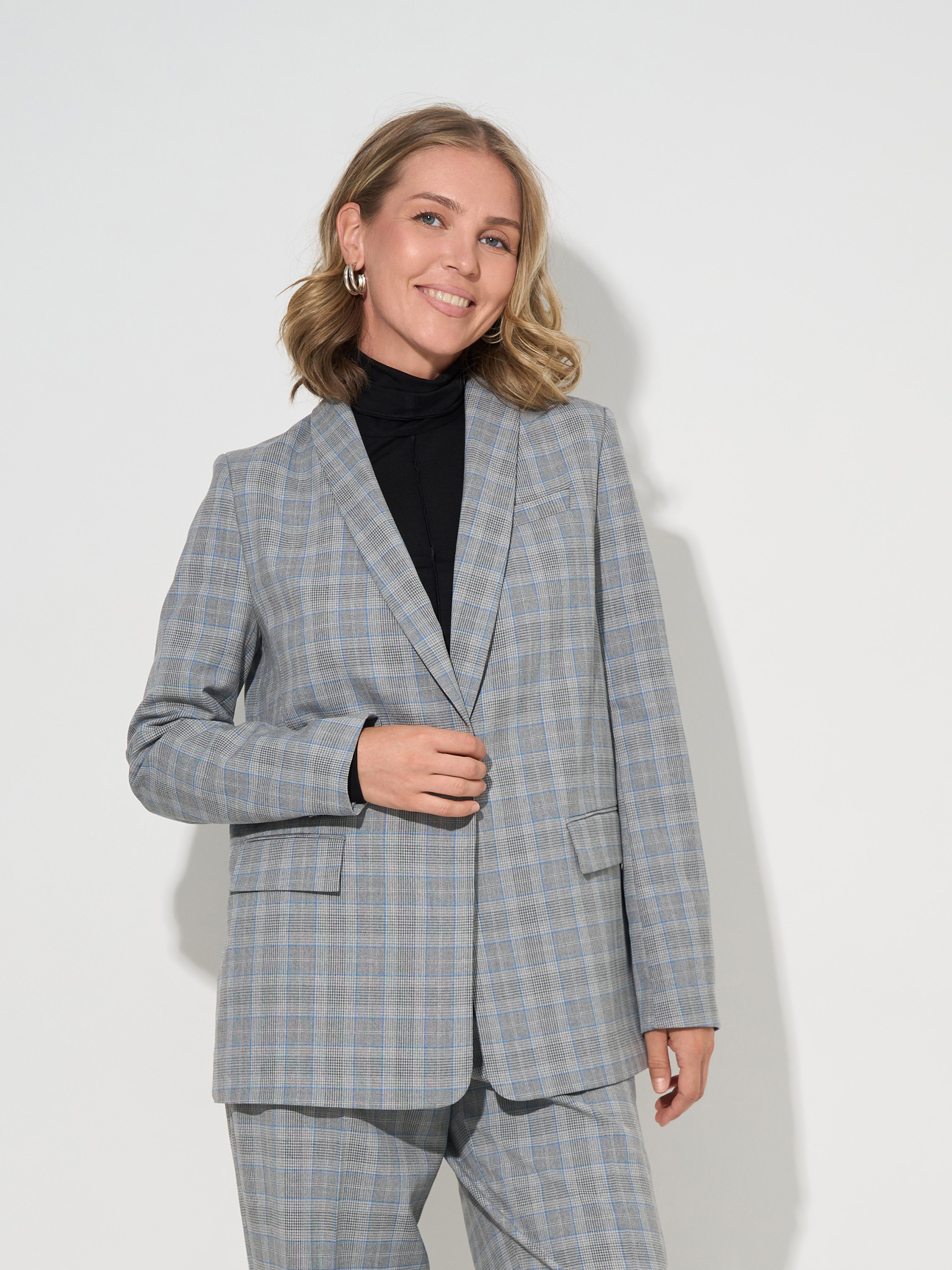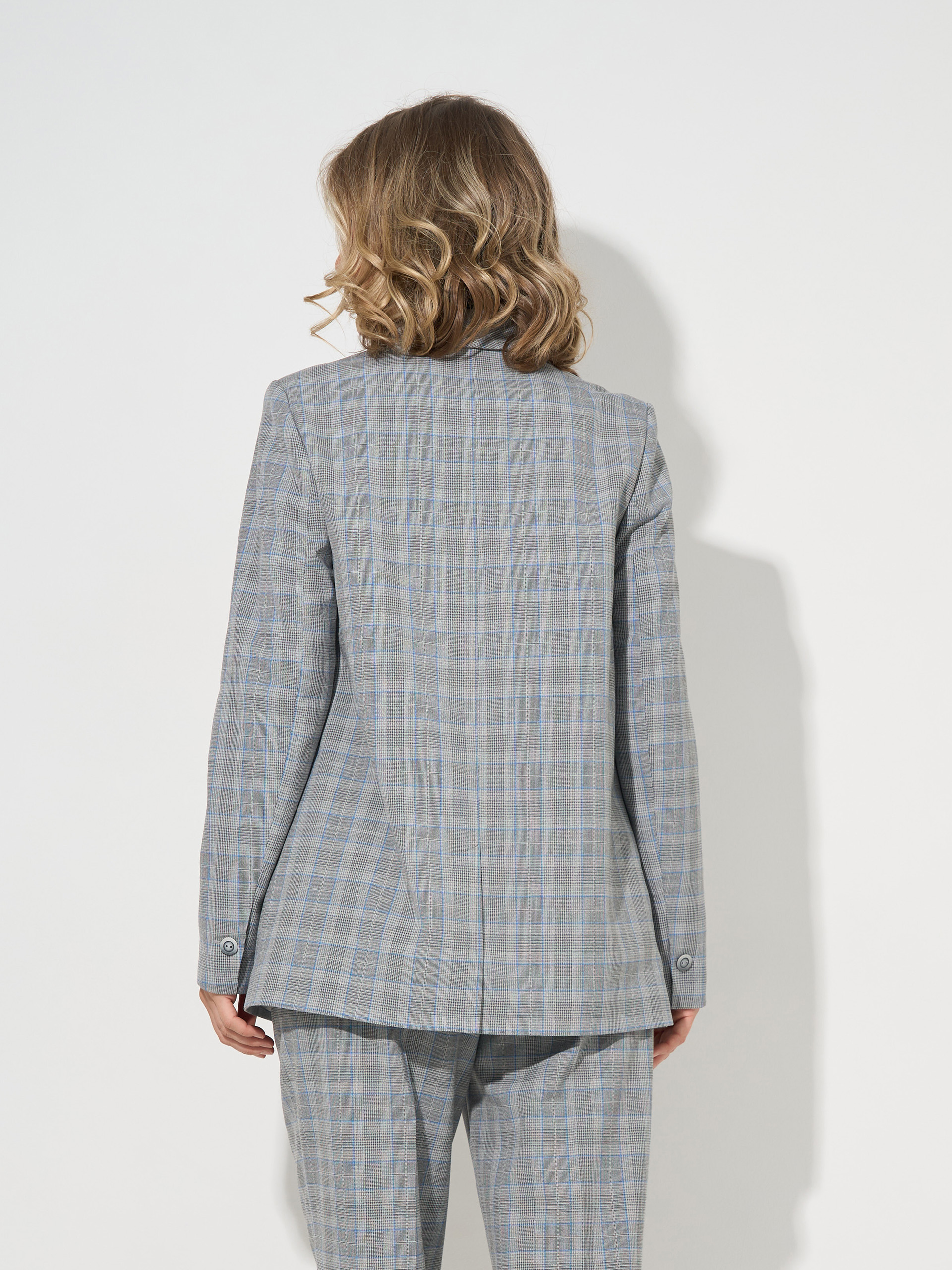 Жакет прямой, неширокий по форме, подклад, из средней по плотности смесовой костюмной ткани в клетку.