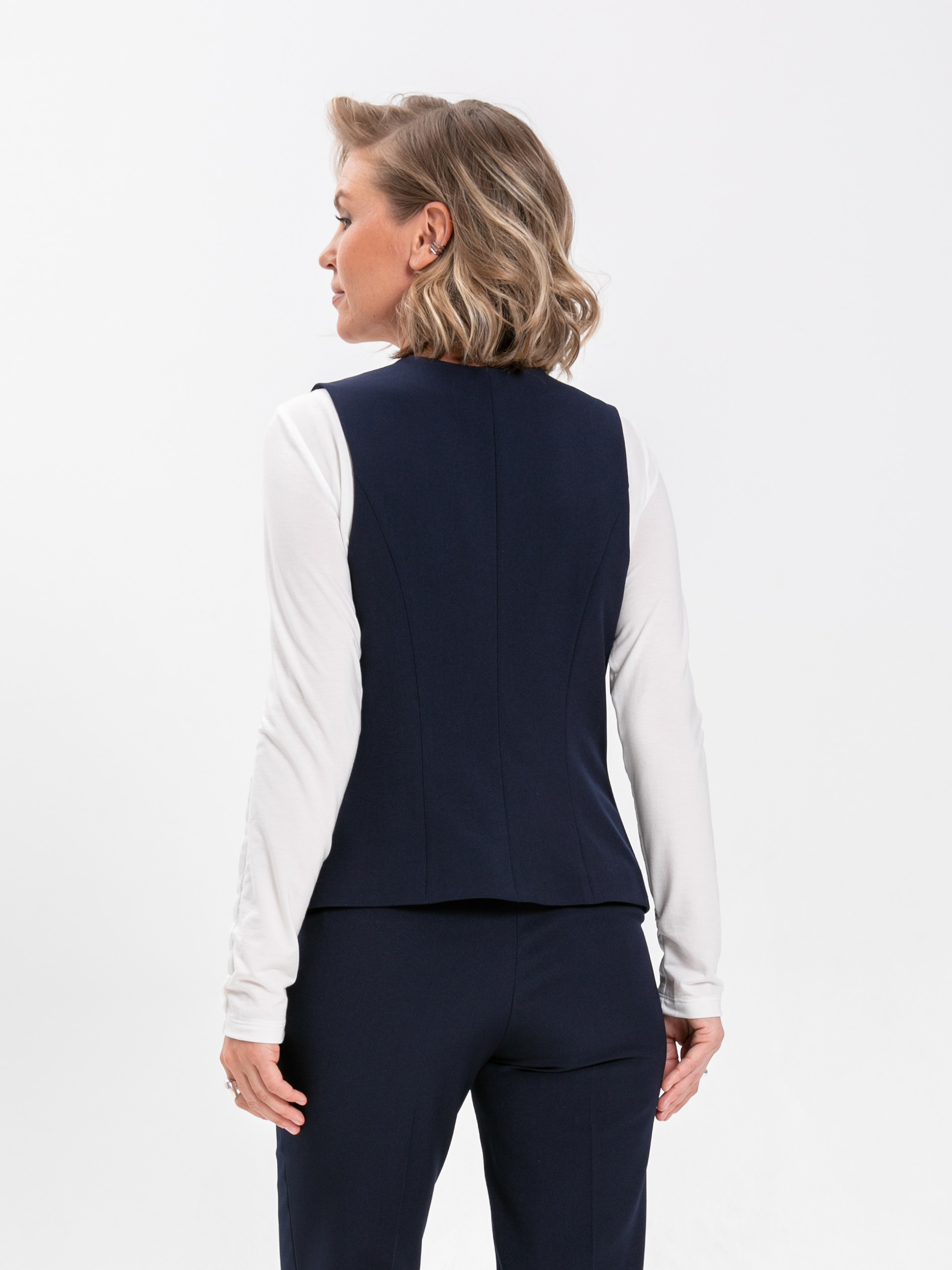Жилет приталенный, классической длины, на подкладе. Из плотной костюмной ткани темно-синего цвета.