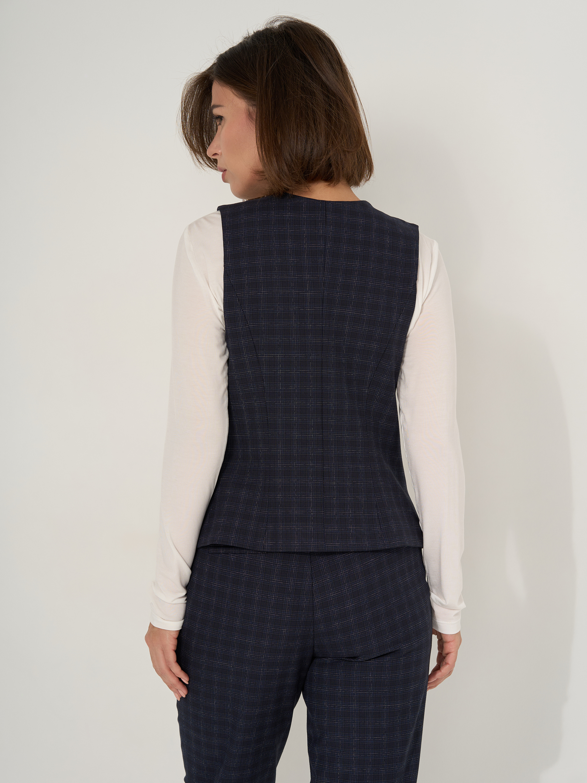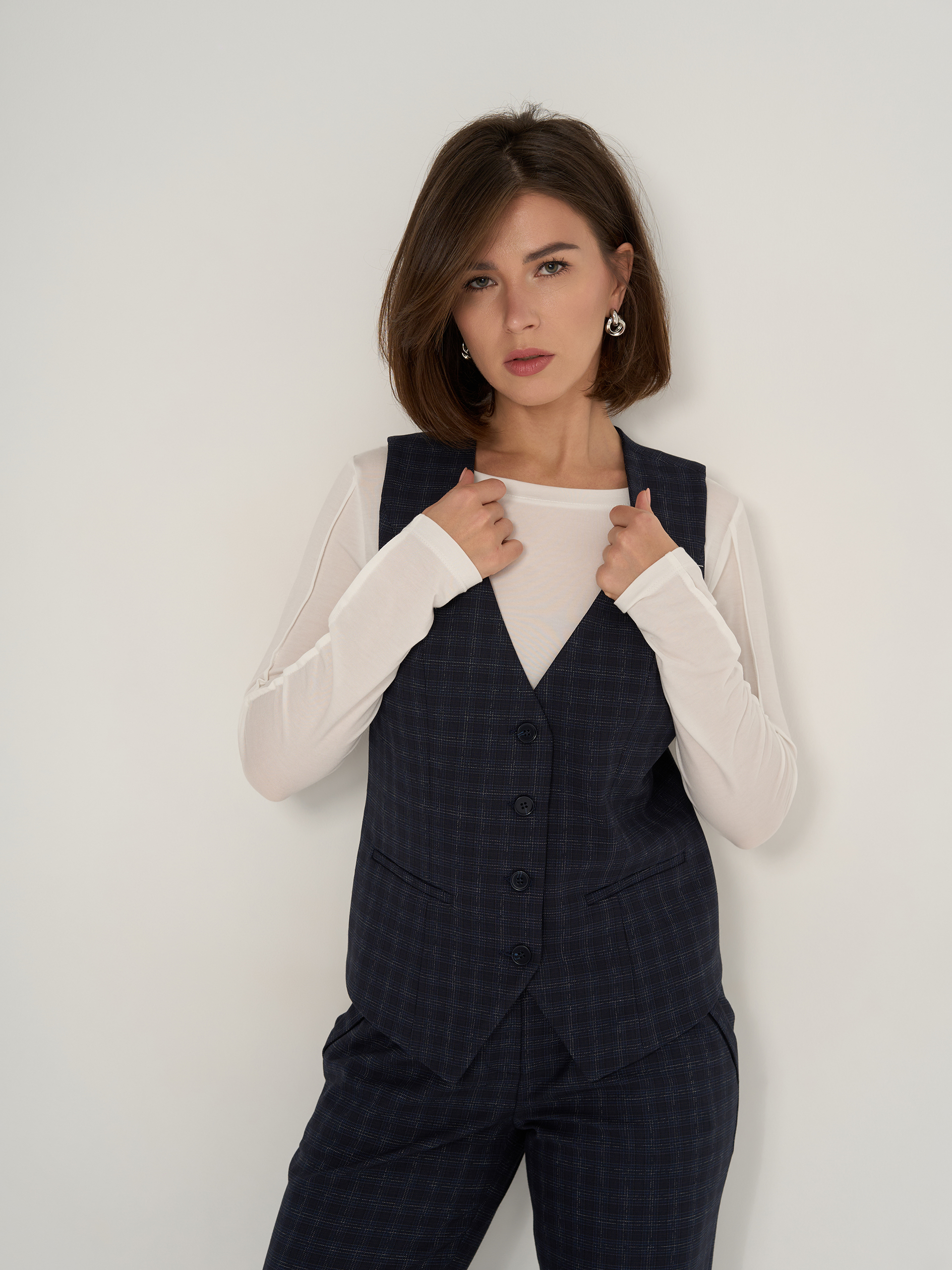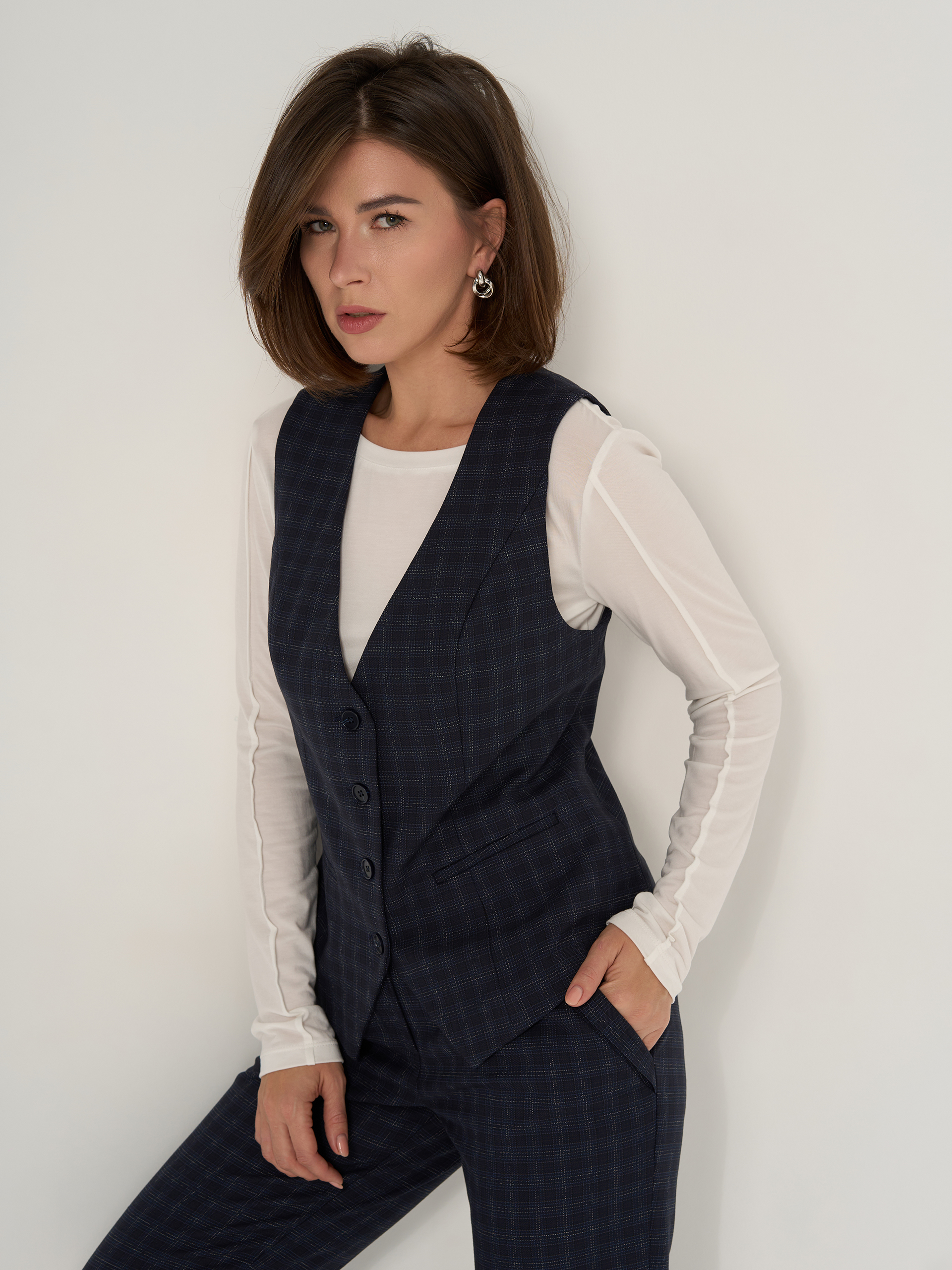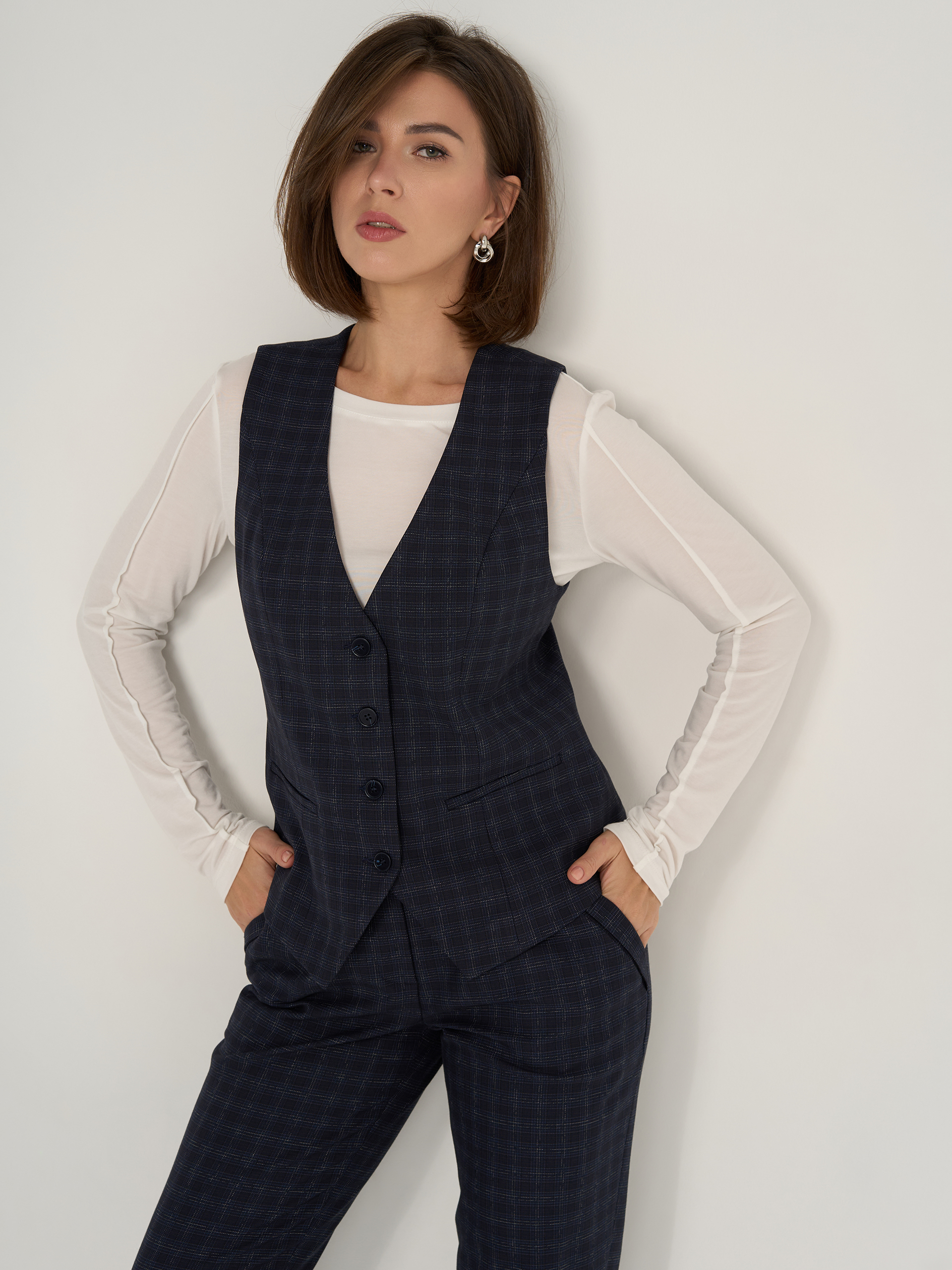 Приталенный жилет на подкладе, длина до бедра. Из вискозной костюмной ткани.