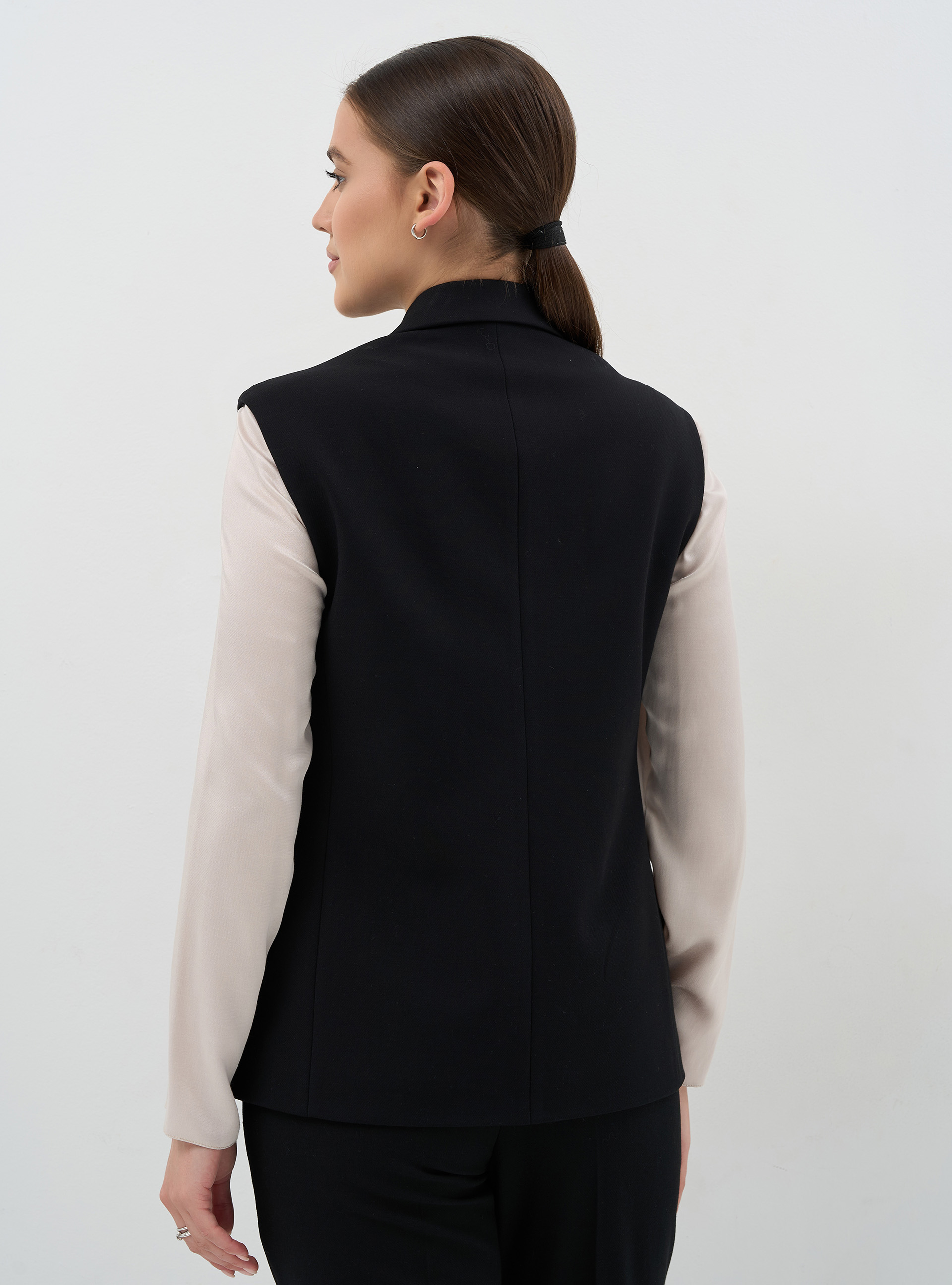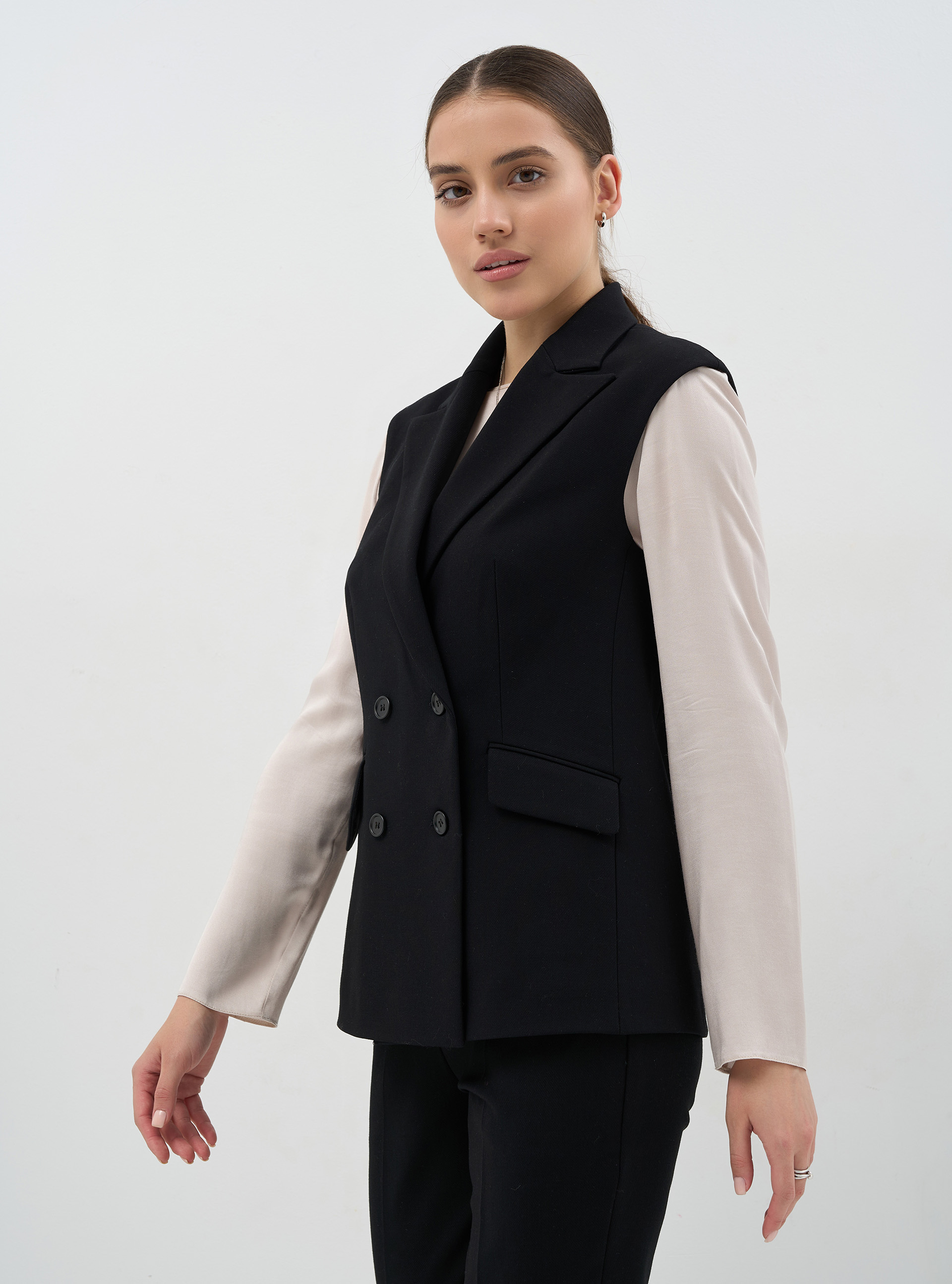 Приталенный двубортный жилет, на подкладке, из средней по плотности пластичной костюмной ткани с фактурой "рубчик".