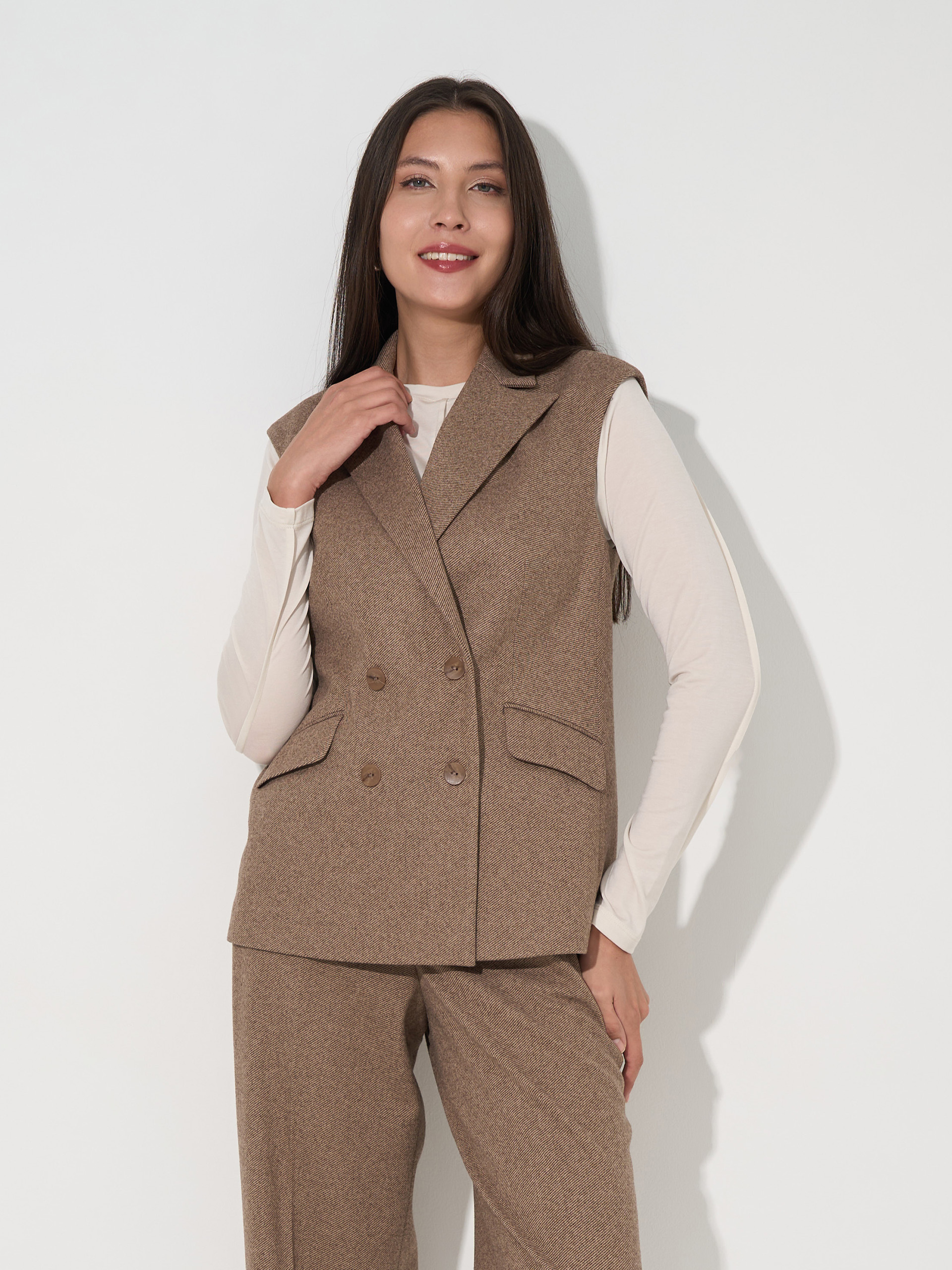 Жилет двубортный, слегка приталенный, на подкладе.