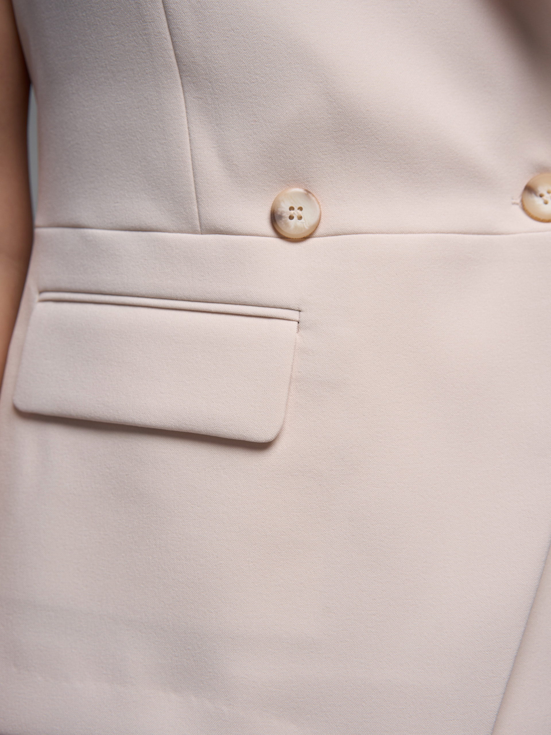 Жилет приталенного силуэта, из гладкой костюмной ткани молочного цвета, с отрезной баской, английский воротник, двубортный, на подкладе.